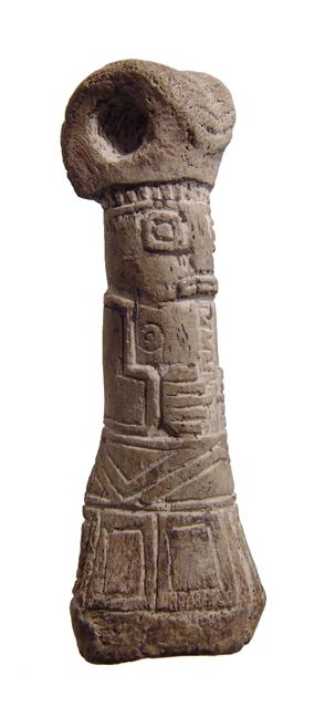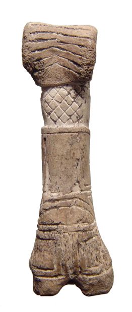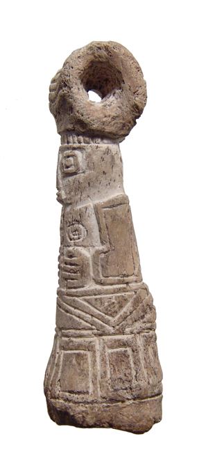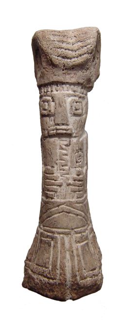 A Huari carved bone amulet from Peru, c. AD 650 - 800, in the form of a shaman or deity, wearing elaborate costume, hands at sides of belly. The face is well detailed with large staring eyes and tall ridged headdress, with suspension hole. H: 2 ½ in (6.4 cm). Intact with excellent style and detail, mineral deposits and light weathering throughout. Ex Hasso von Winning collection; Ex J. L. Malter collection.
