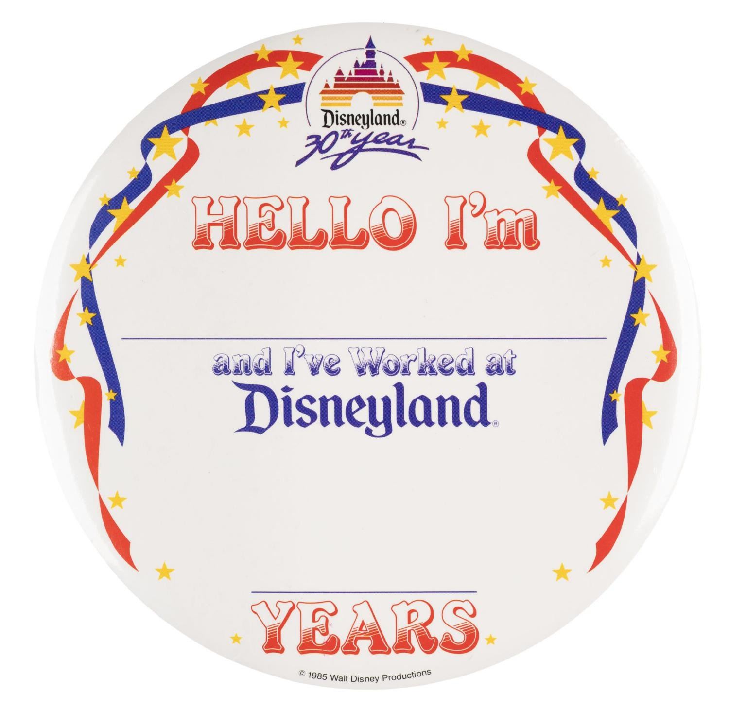 (Disneyland, 1985) An oversized Cast Member button from the 30th-anniversary celebration of Disneyland, with blanks to fill in their name and how long they’ve worked at the Park. Measuring 6” in diameter, the unused button is in very good condition with very light handling wear.