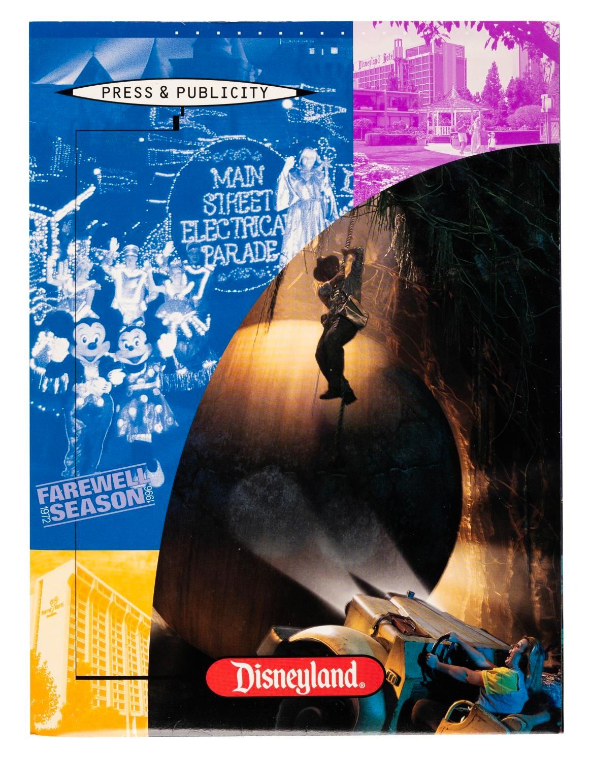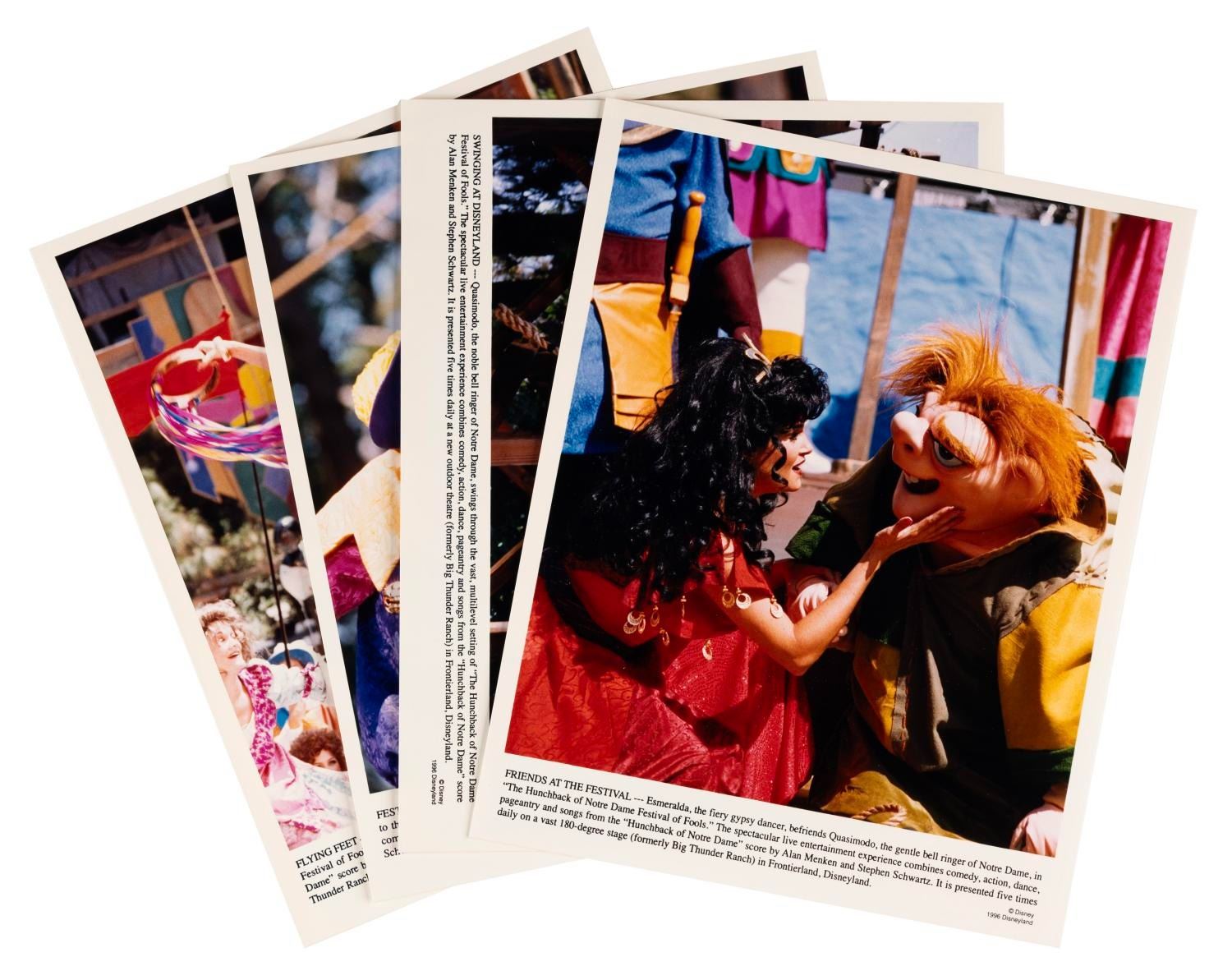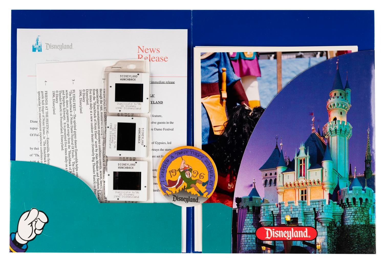 (Disneyland, 1996) A Press kit for the Hunchback of Notre Dame "Festival of Fools" show at Disneyland. The folder includes four 8" x 10" color gloss press photos, seven 35mm slides, a press release, and a 3" souvenir button from the show. The press kit is overall in very good condition.