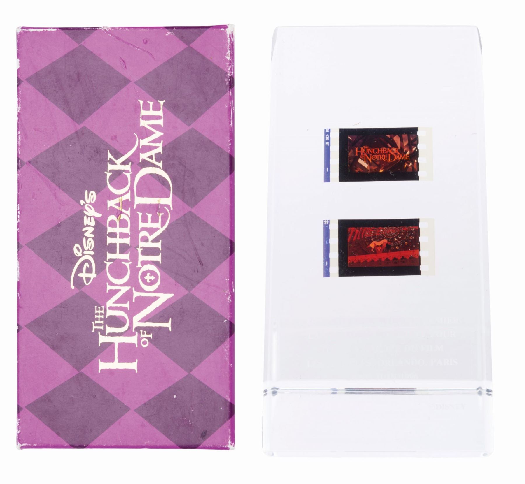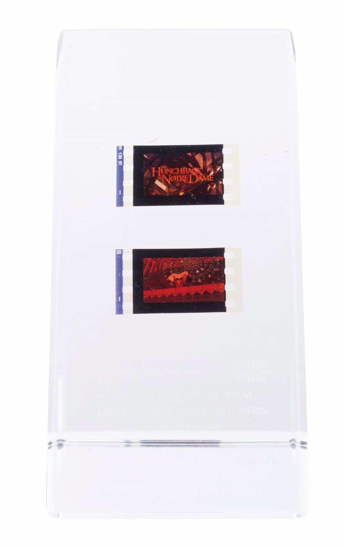 (Disney, 1996) A Cast and Crew gift from the world premiere of “Hunchback of Notre Dame” with the original box. The lucite wedge paperweight contains two 35mm frames of the film. Measuring 2.5” x 2.5” x 4.75” high, the piece is in very good condition. The 3.25” x 2.75” x 6” box is in fair condition with heavy edge wear.
