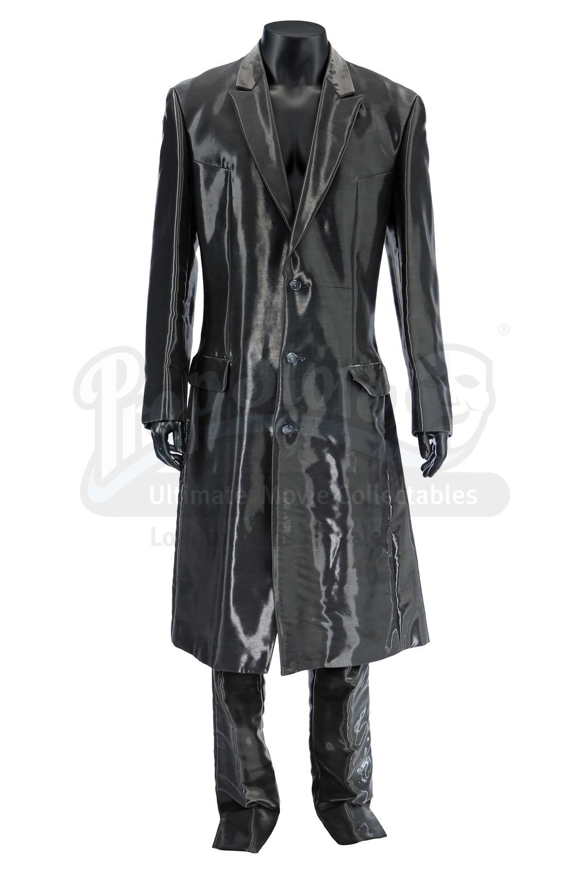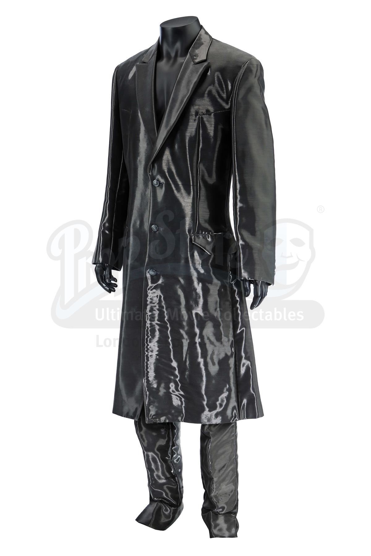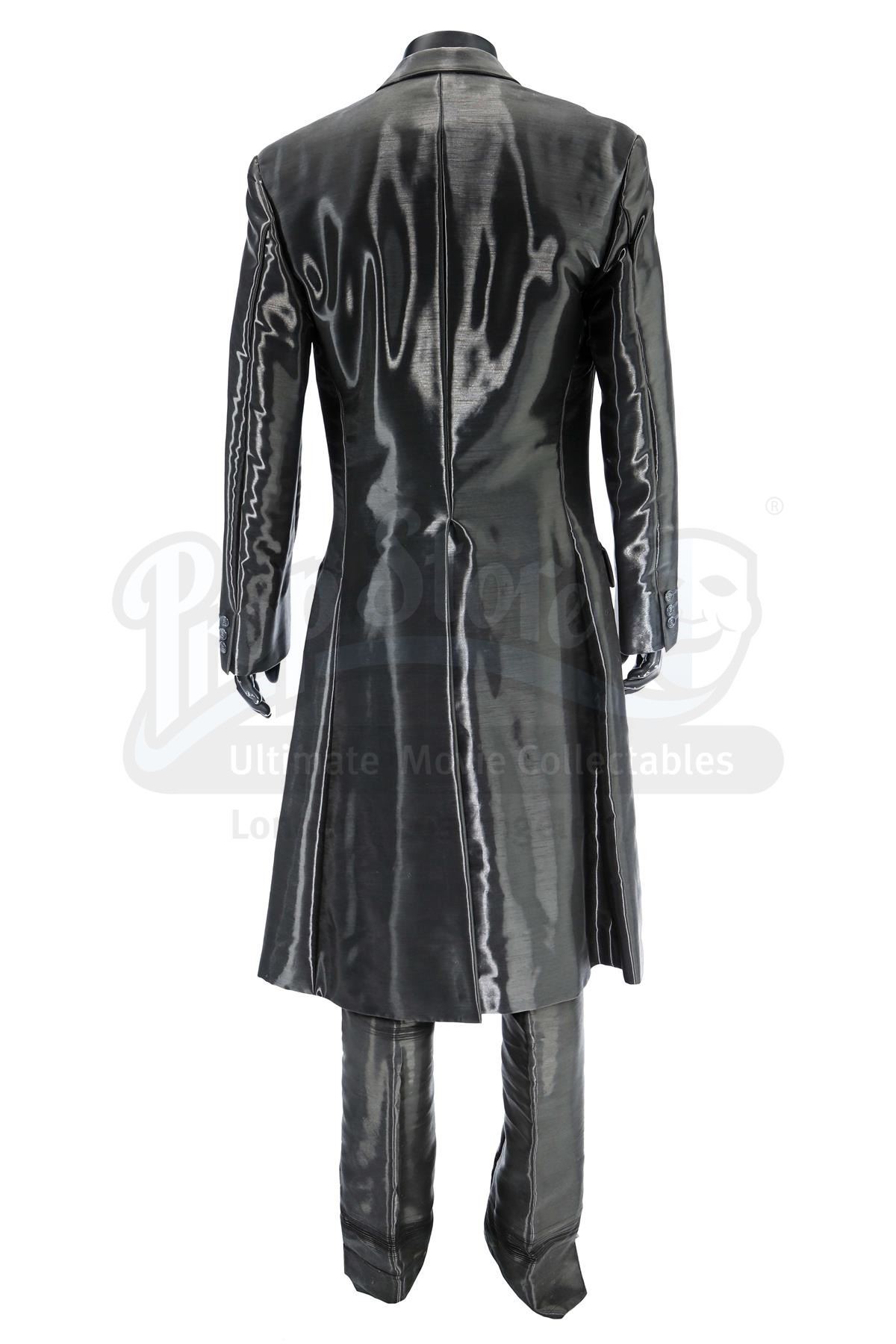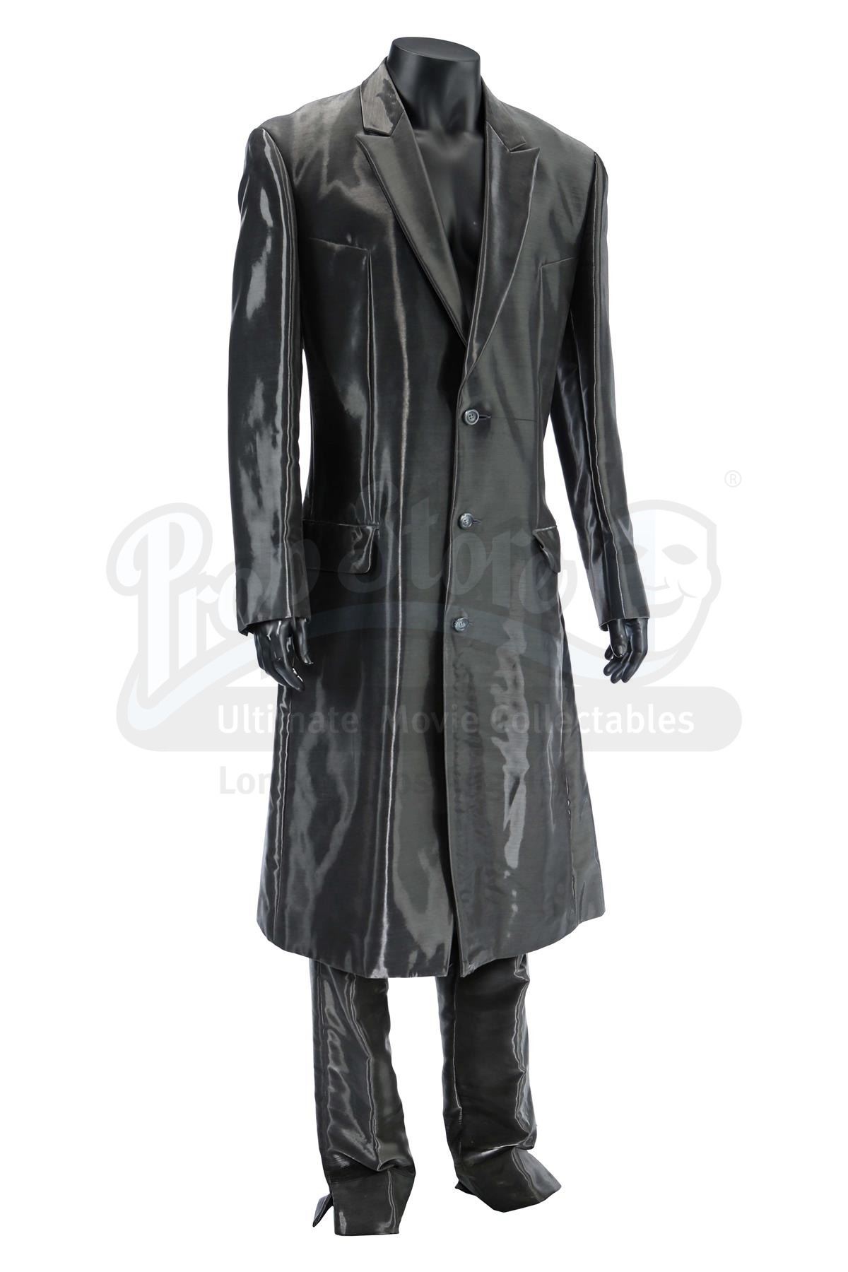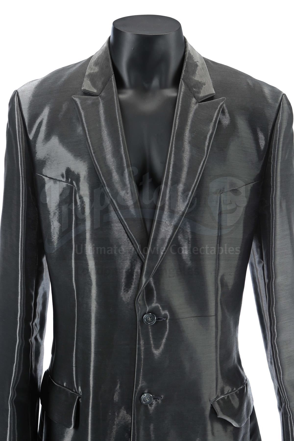 This two-piece suit consists of a pewter-coloured button-up coat and matching high-rise slacks, both lined with futuristic, shiny woven polymer and acetate thread. The suit is presented with a wardrobe tag marked "A.I. Artificial Intelligence Gigolo Joe (Stunt) Ch? AI -9". It exhibits visible signs of wear, including torn shiny thread throughout and harness chafing damage to the slacks.