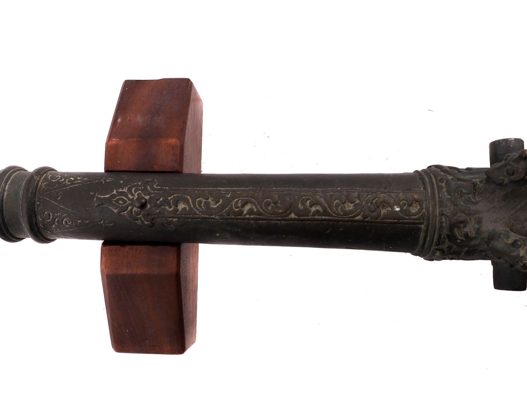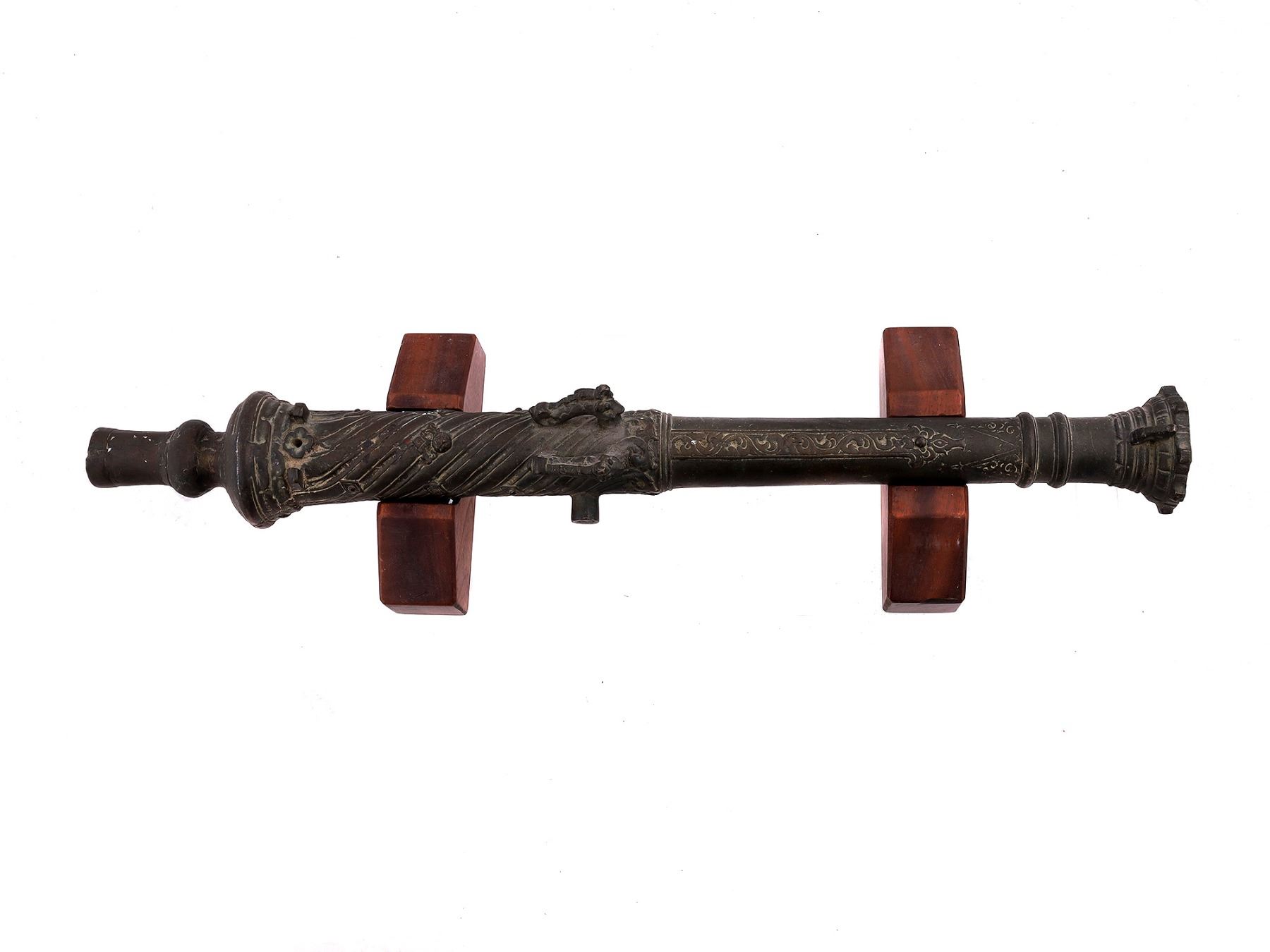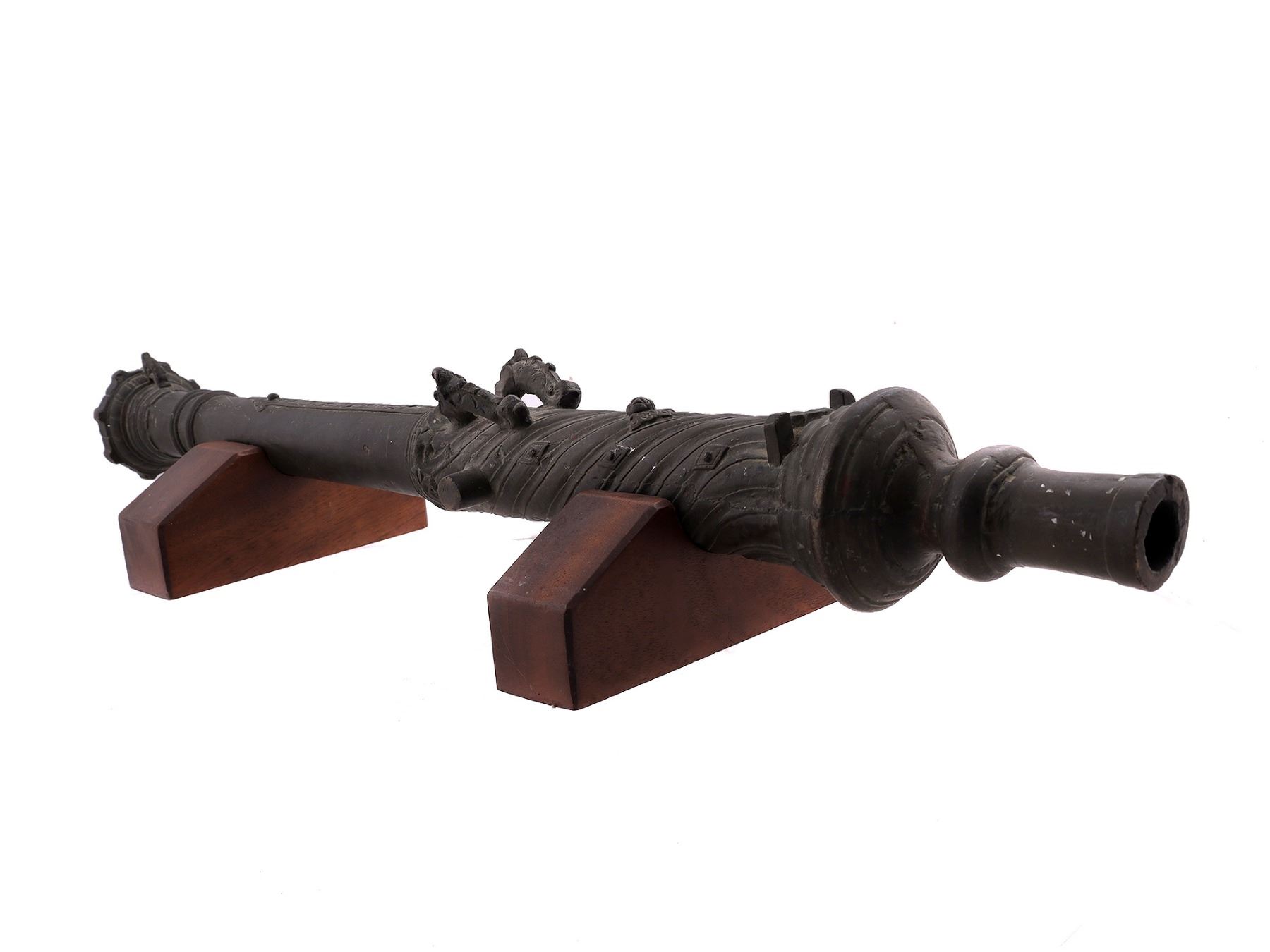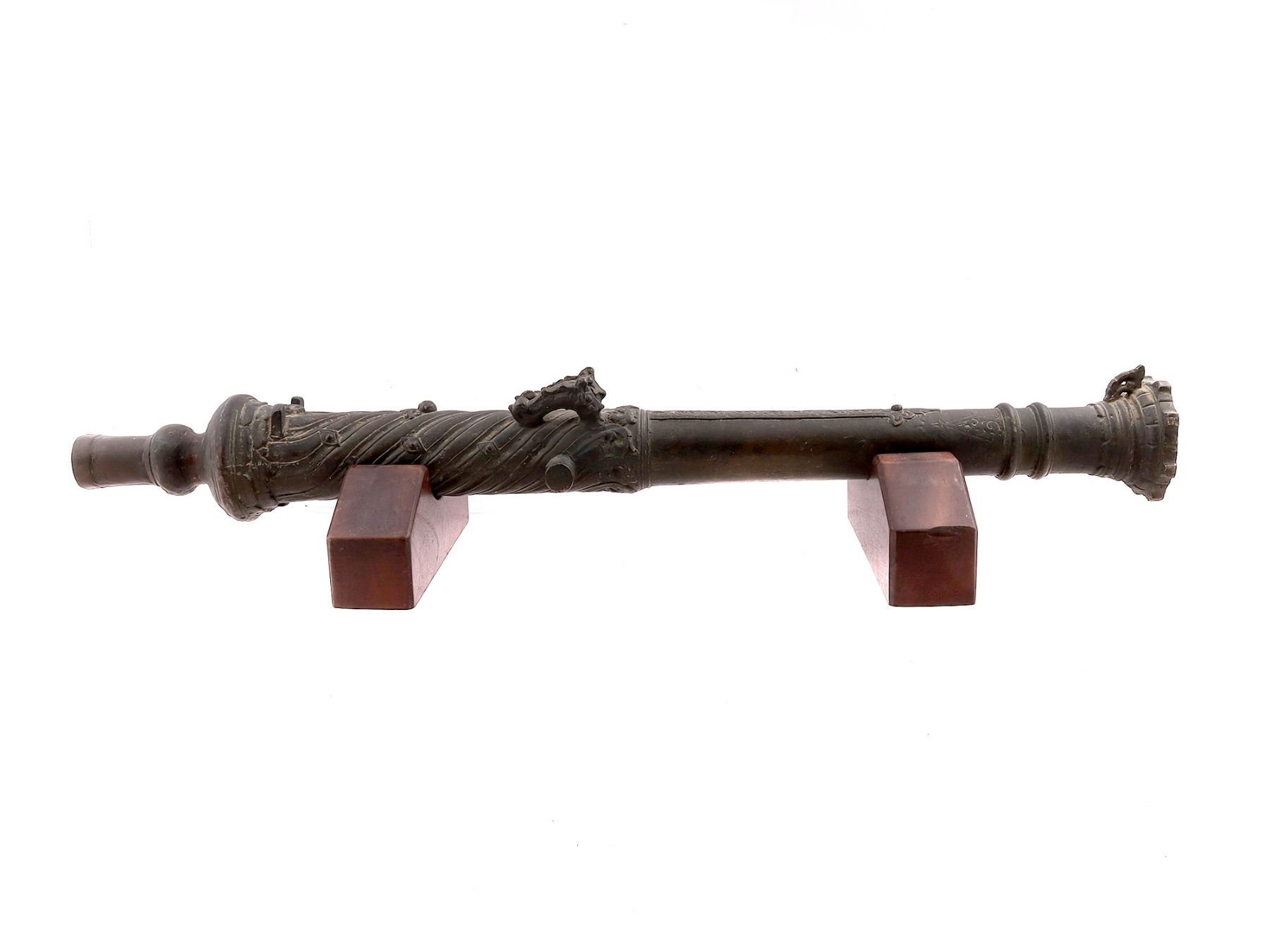 Bronze lantaka (swivel cannon), late 18th century. This type of small gun comes from the swivel guns mounted on Portuguese and Spanish ships of the 16th century. This cannon has an elaborate decoration with a prominent muzzle. Complete with two wooden stands.
