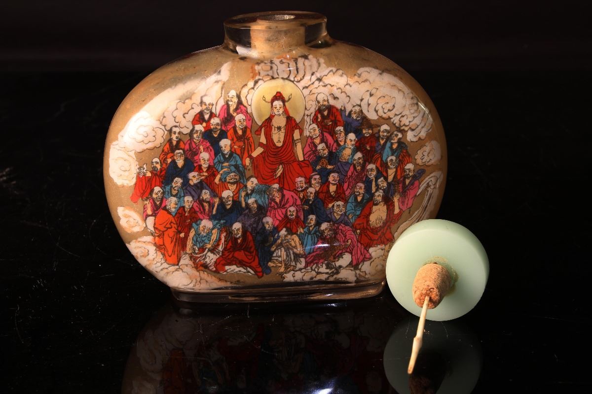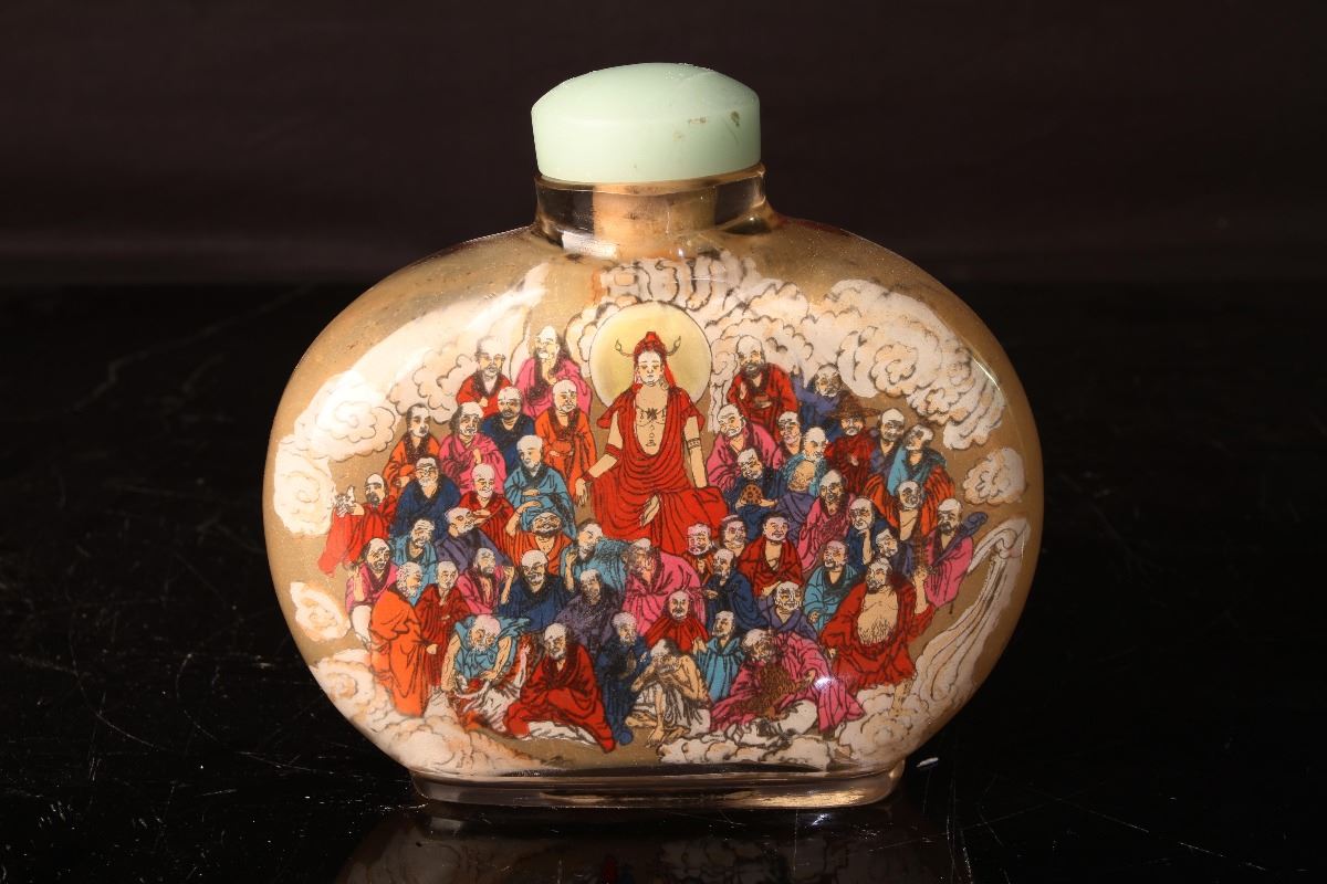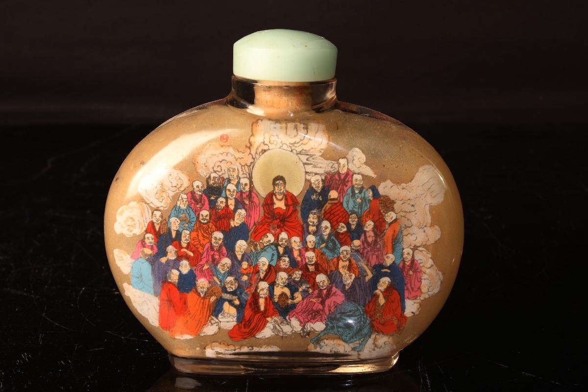 A INSIDE PAINTING SNUFF BOTTLE WITH HUNDRED OF ARHAT W:5" H:5.5"内画108罗汉图鼻烟壶