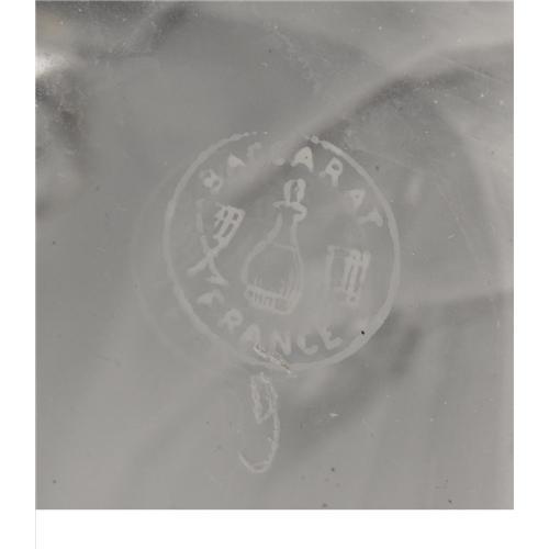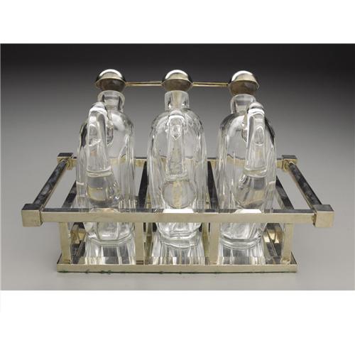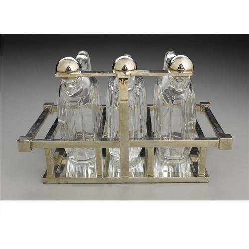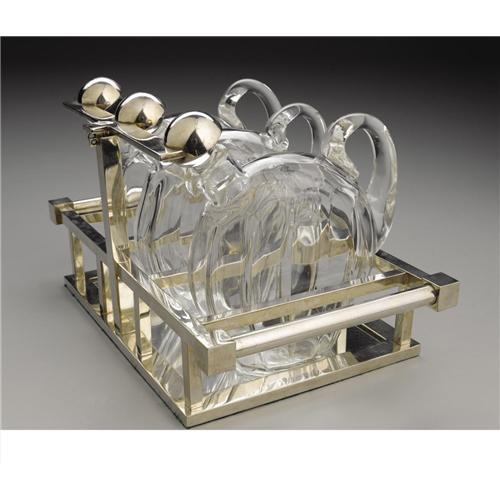 <B>A French Art Deco Glass And Nickel Plate Tantalus</B></I><BR><BR>Design attributed to Jacques Adnet (French, 1901-84)<BR>Manufactured by Baccarat, France<BR>Circa 1930<BR>Glass and nickle plate<BR>Marks: <I>Baccarat France</B></I><BR>8.1 in. high x 13 in. long<BR><BR>The three flattened sphere form decanters with ball stoppers, supported in a nickel plated rectangular geometric form three stall holder with a mirrored foot, three caps attached to a single elevating bar lock down on the corresponding glass stoppers