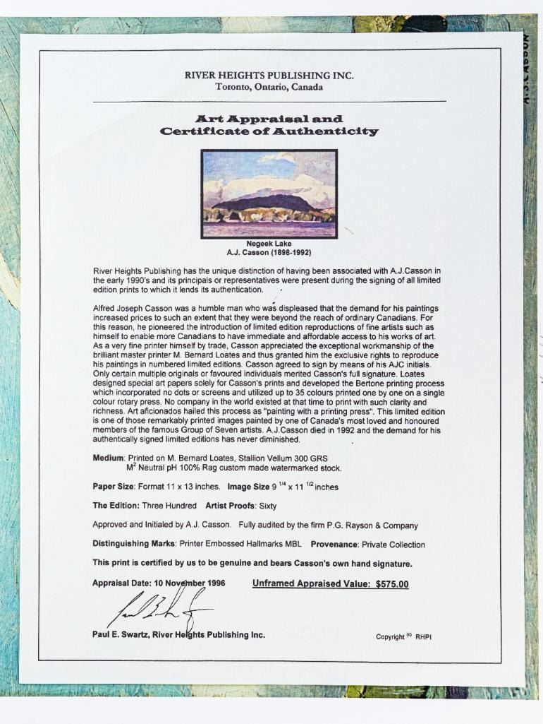 A.J. Casson 1898-1992 Group of Seven Member, Litho 11 x 13, "Negeek Lake", Original Hand Signature, COA & Appraisal :$575.00 (2015)