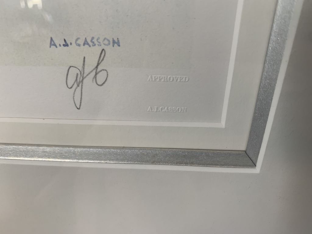 A.J. Casson's "School House" limited edition print, signed lower right, and numbered 30/700 lower left. This piece is of 5 people outside a red school house, in the middle of winter. This piece has been professionally double matted with acid free matting, has an inner fillet, and has been custom framed under glass.