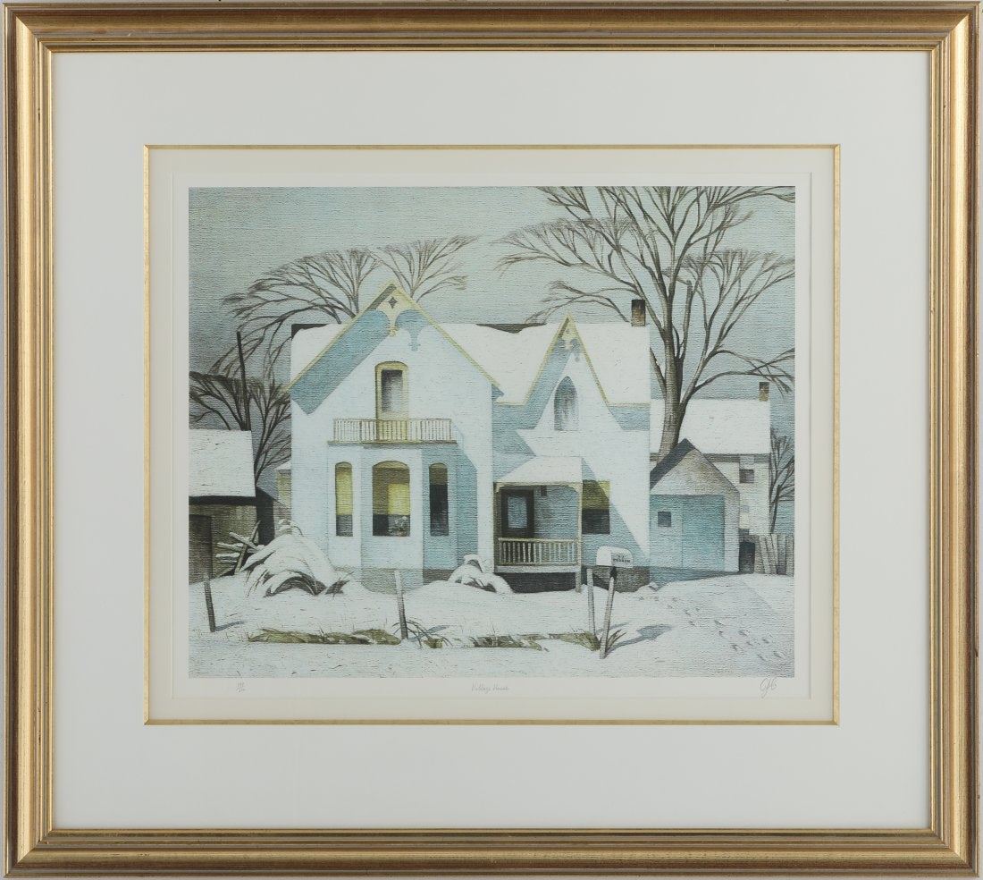 A.J. Casson's "Village House" limited edition print, signed and numbered 178/250. This piece has been professionally double matted, and custom framed under glass. Image- 18" x 22". Frame- 32" x 35 1/2".