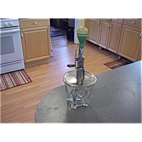 This is an A&J green and cream handle beater with the original jar. The handle has the original paint and does have some crazing but is intact. The jar has no cracks, but does have a teensy nick under the jar rim. I only found it by feeling. You can hardly see it. The top of the lid does show minor wear. It is 11.5" tall. It's very hard to find these with the green and cream paint in such good condition so don't miss out on this great collectible.<BR>
