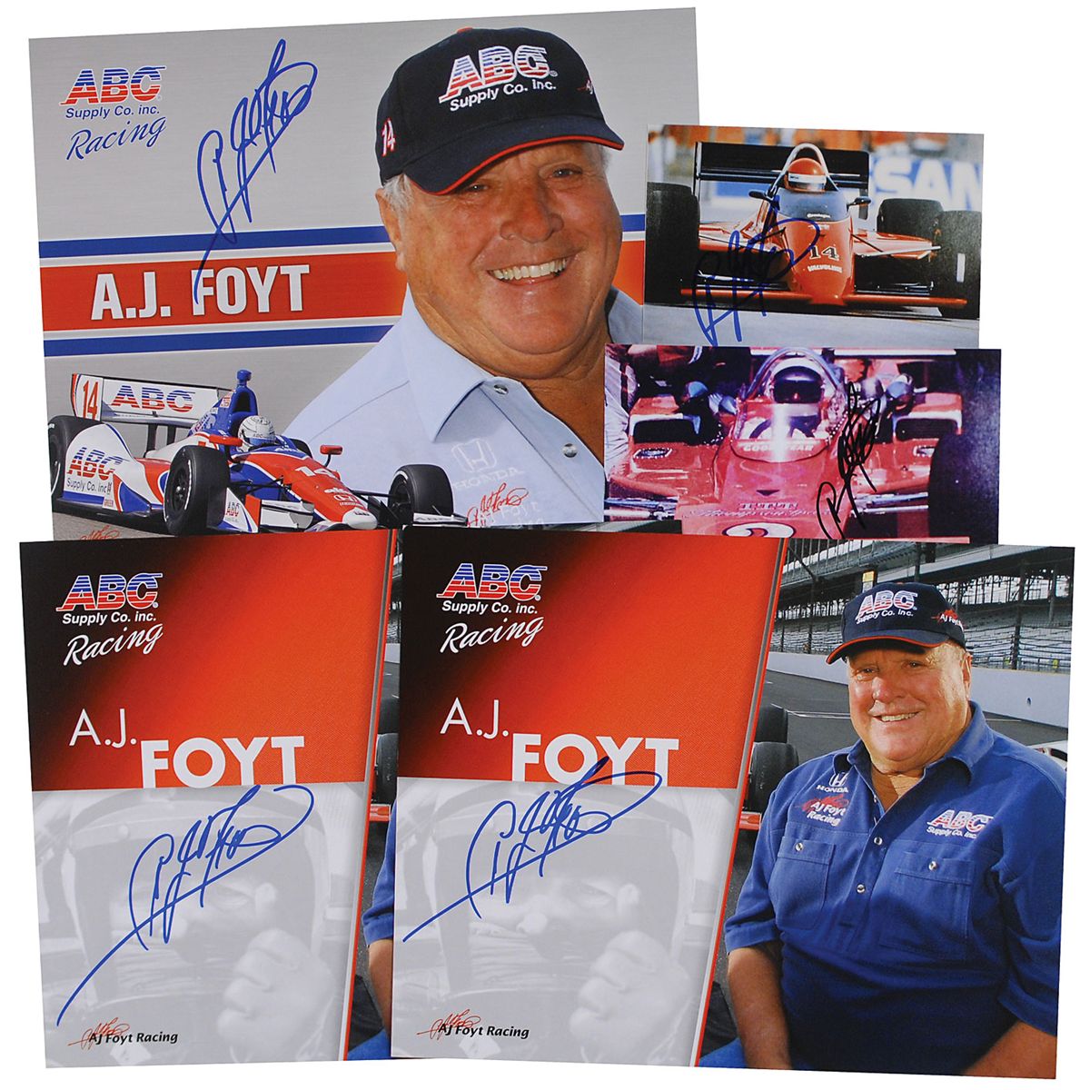 Five signed color satin-finish and cardstock photos, two approximately 5 x 3 and three 10 x 8, each signed in blue or black felt tip by Foyt. In fine condition.