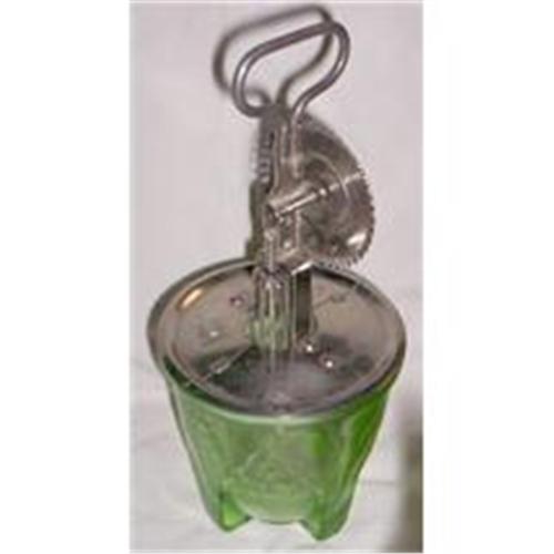 wonderful old beater jar with original beater lid! This is a green depression glass jar. It has a,