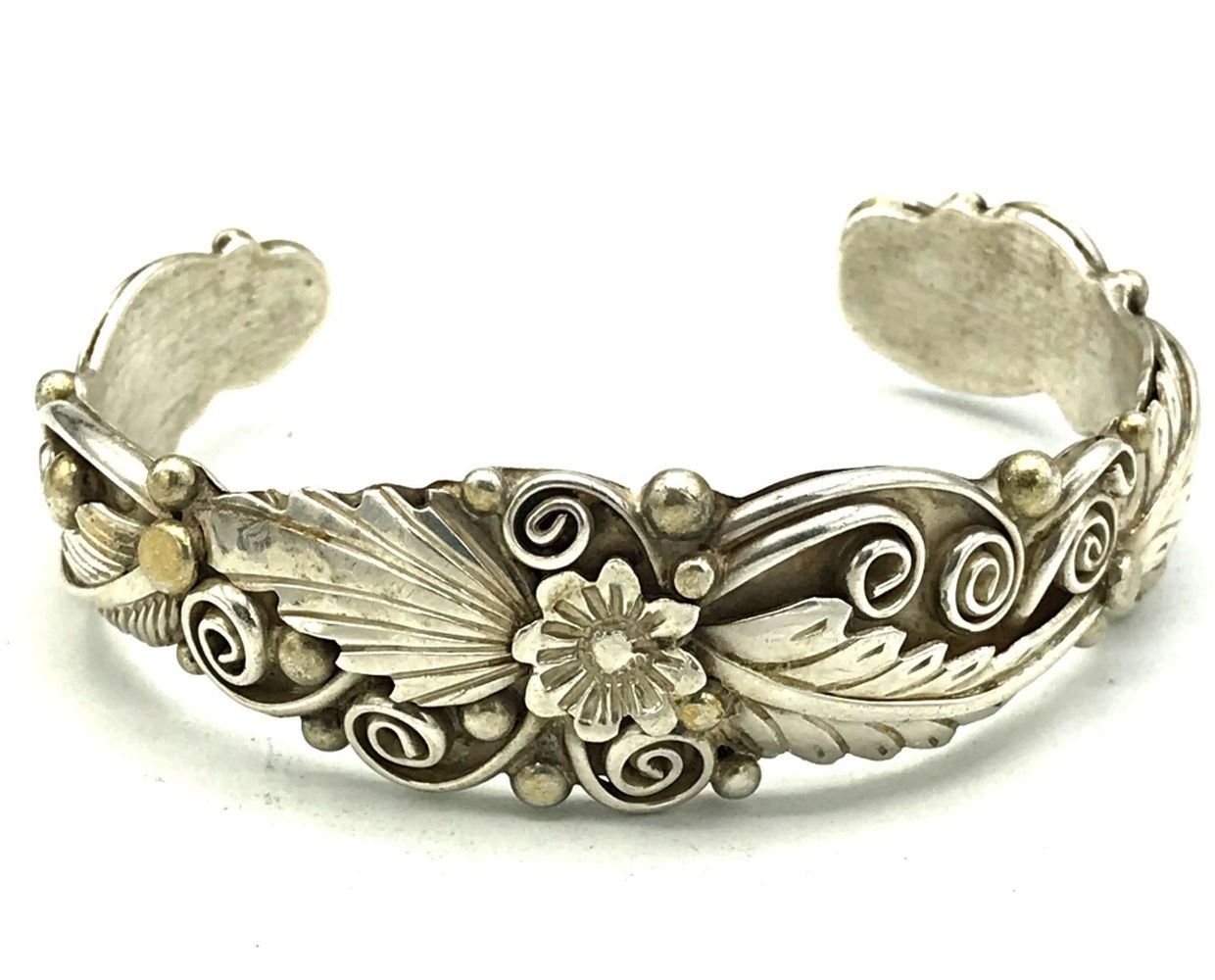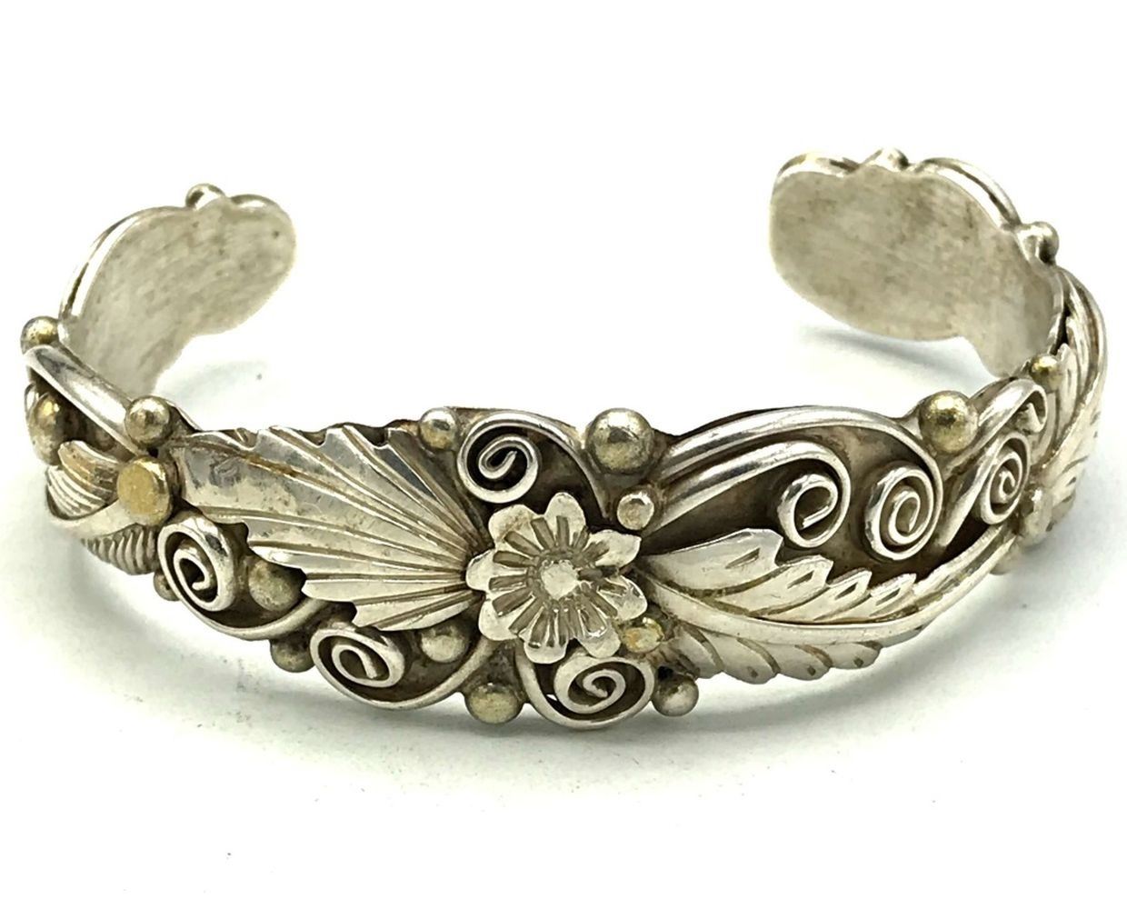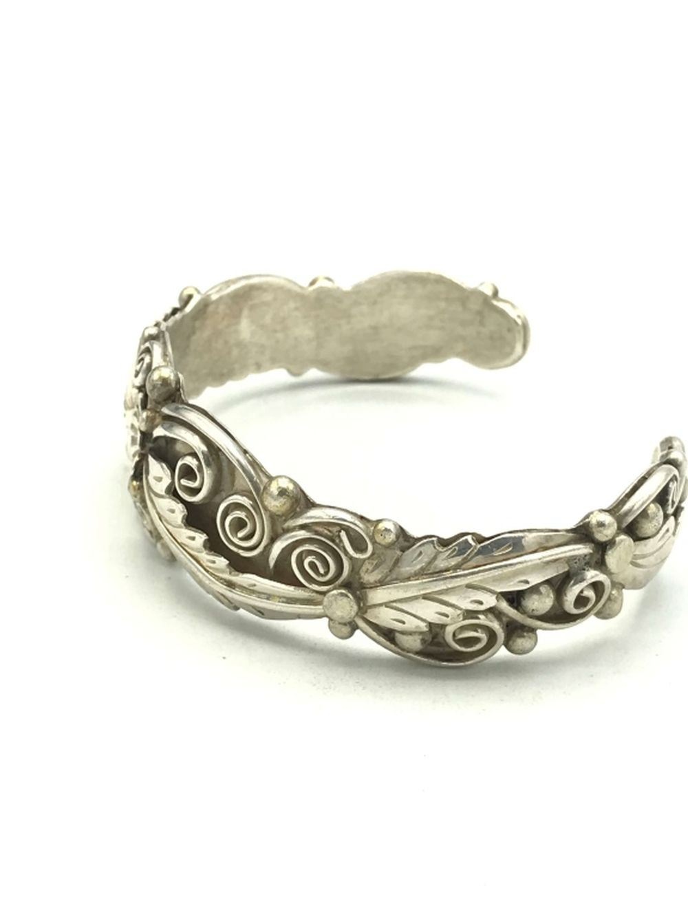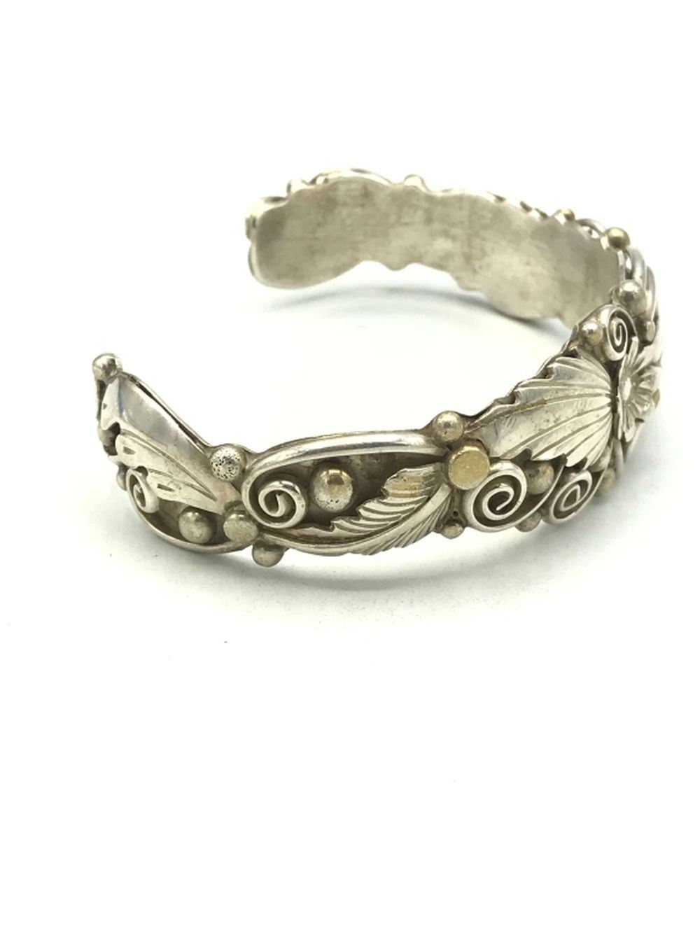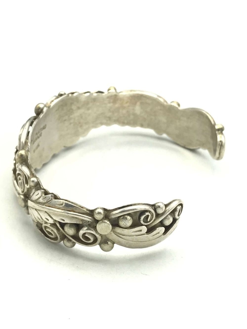 BEAUTIFUL PLETHORA OF HAND CARVED SILVER LEAVES W ACCENTING SWIRLING STEMS, FLOWERS, AND RAINDROPS. THE DETAILS ON THE BRACELET ARE TOP NOTCH WEIGHS 21.0 DWT TOTAL VINTAGE NAVAJO PLATERO BRACELET THICK AND HEAVY
