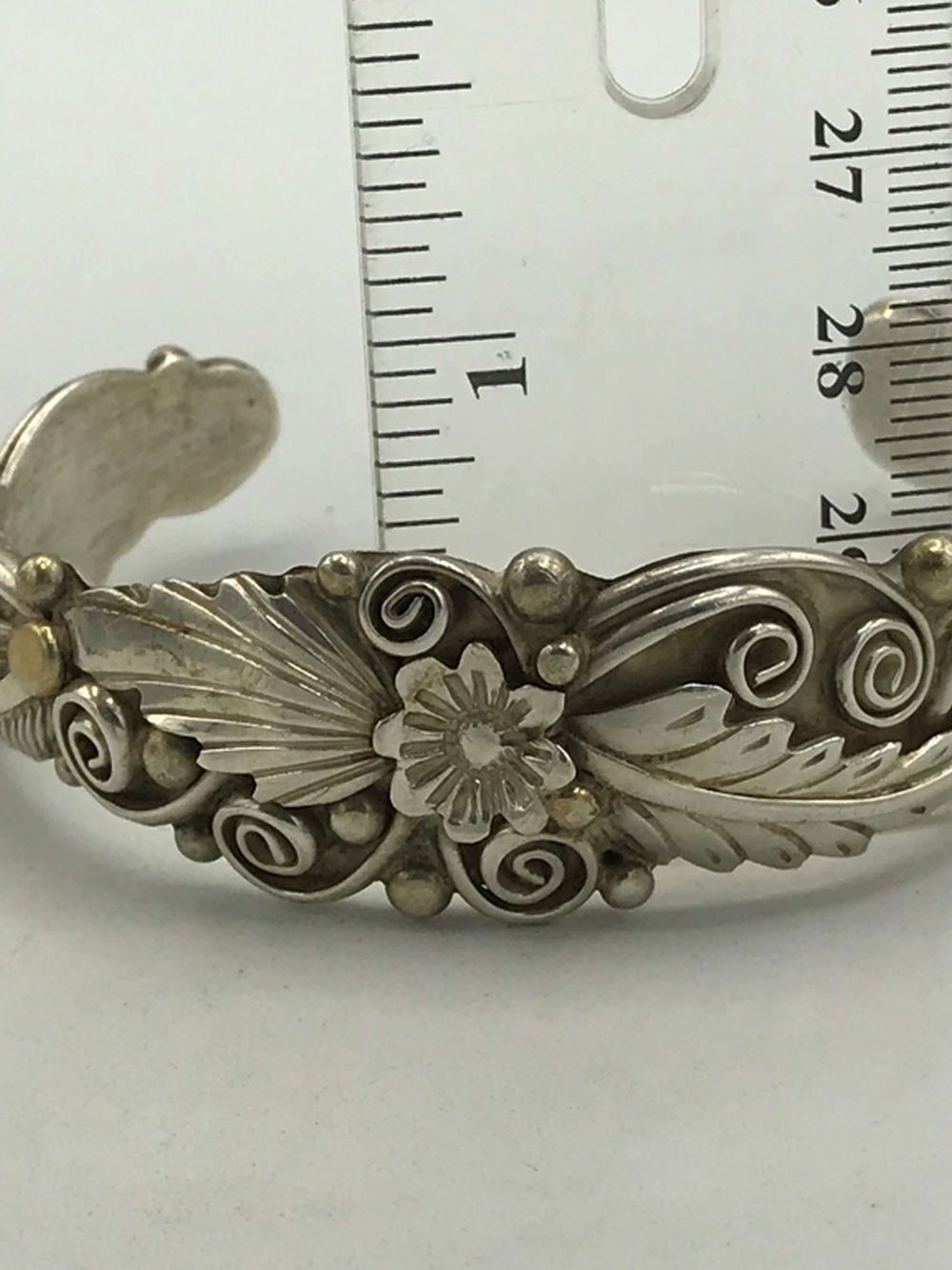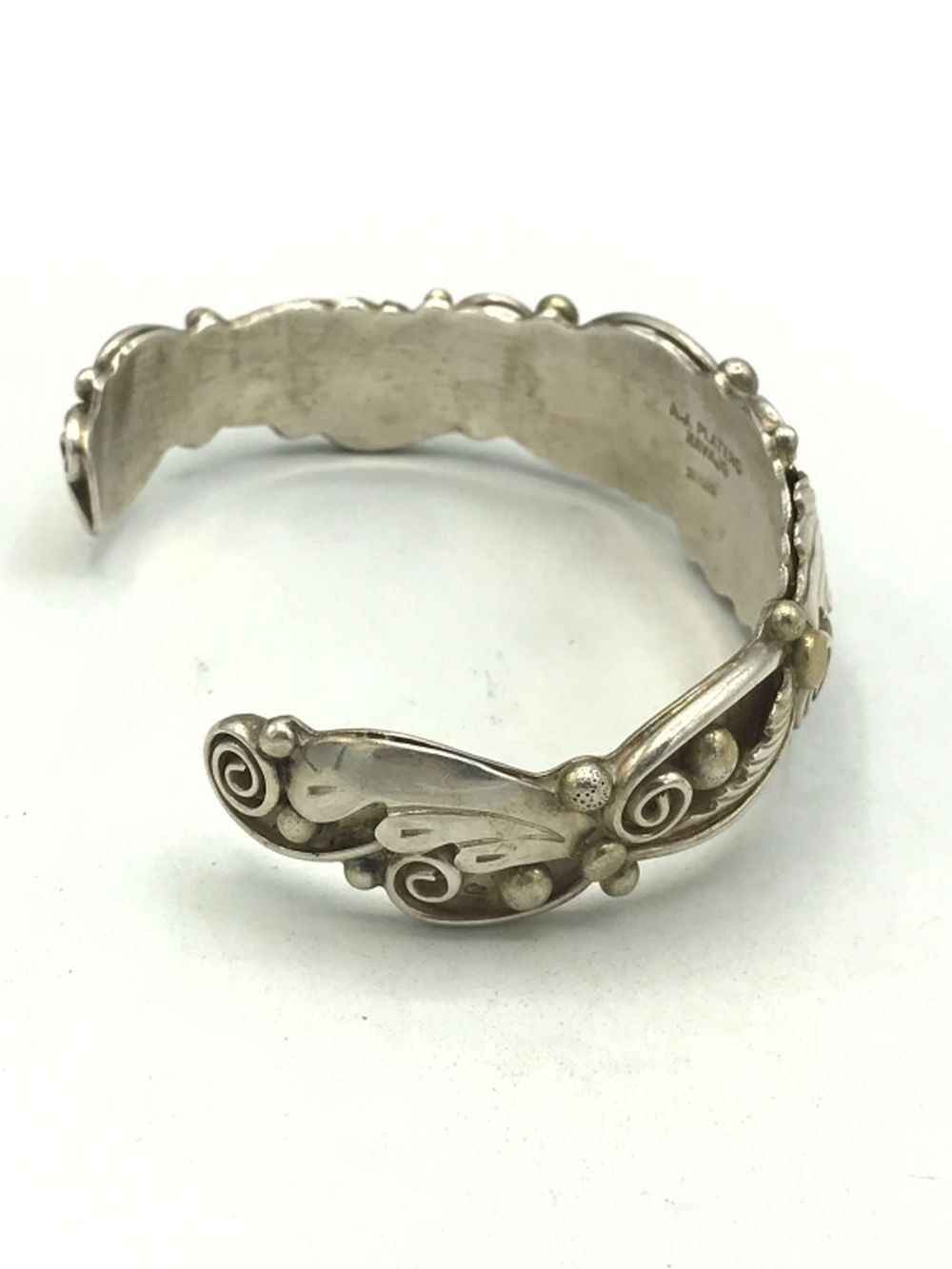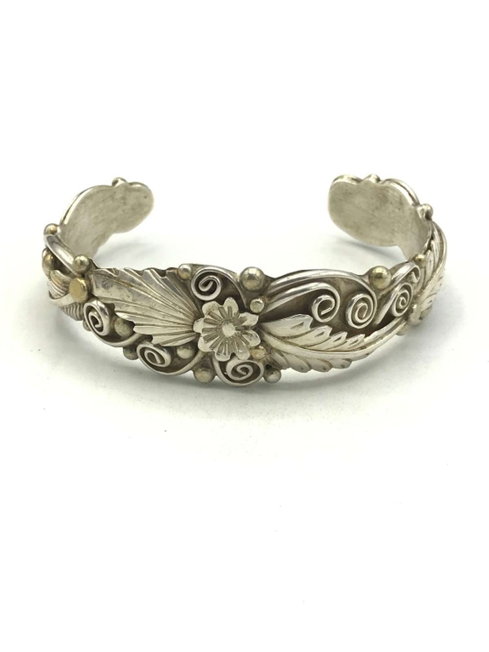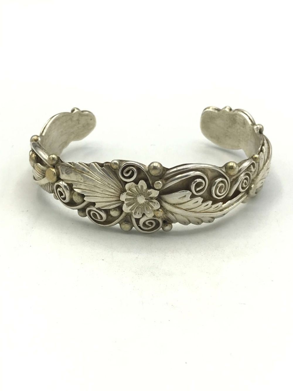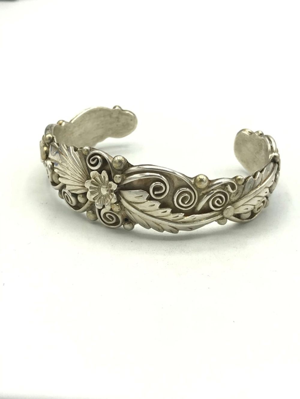 BEAUTIFUL PLETHORA OF HAND CARVED SILVER LEAVES W ACCENTING SWIRLING STEMS, FLOWERS, AND RAINDROPS. THE DETAILS ON THE BRACELET ARE TOP NOTCH WEIGHS 21.0 DWT TOTAL VINTAGE NAVAJO PLATERO BRACELET THICK AND HEAVY