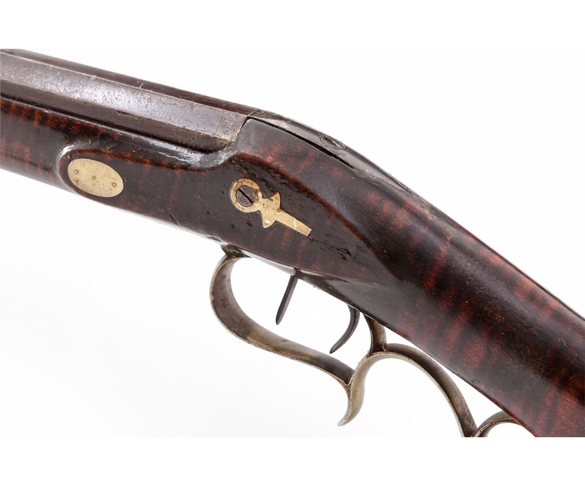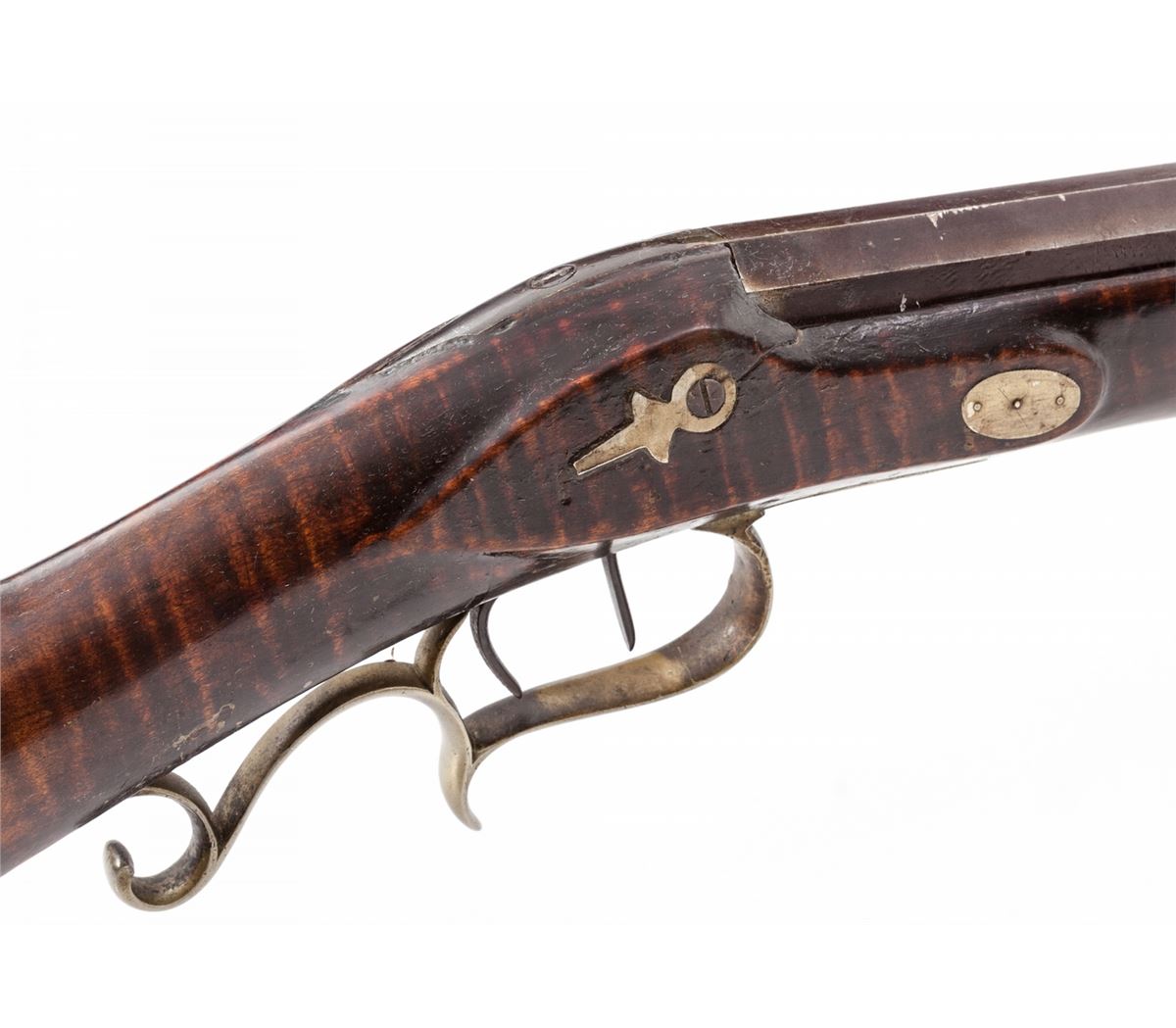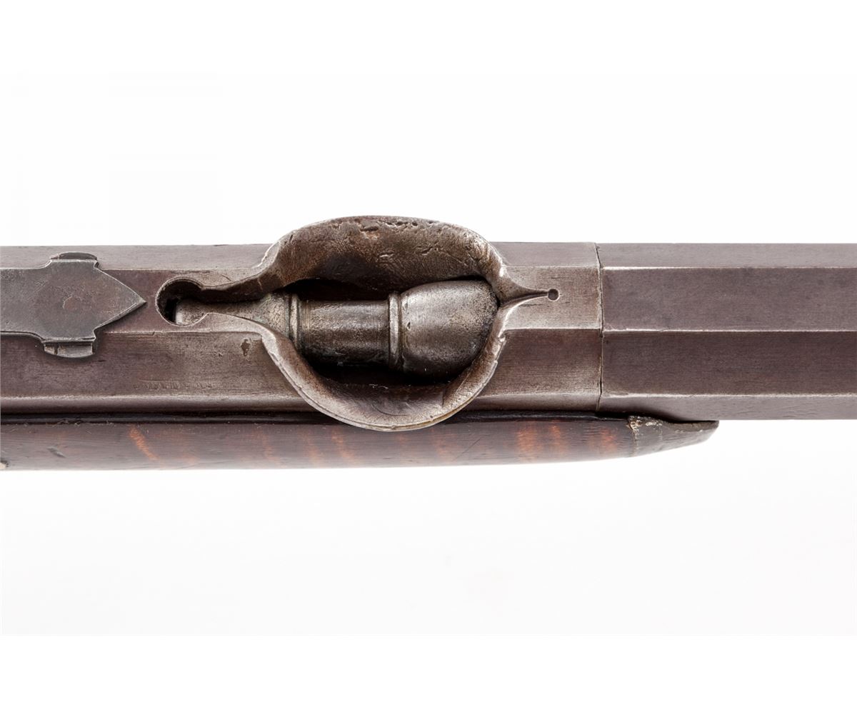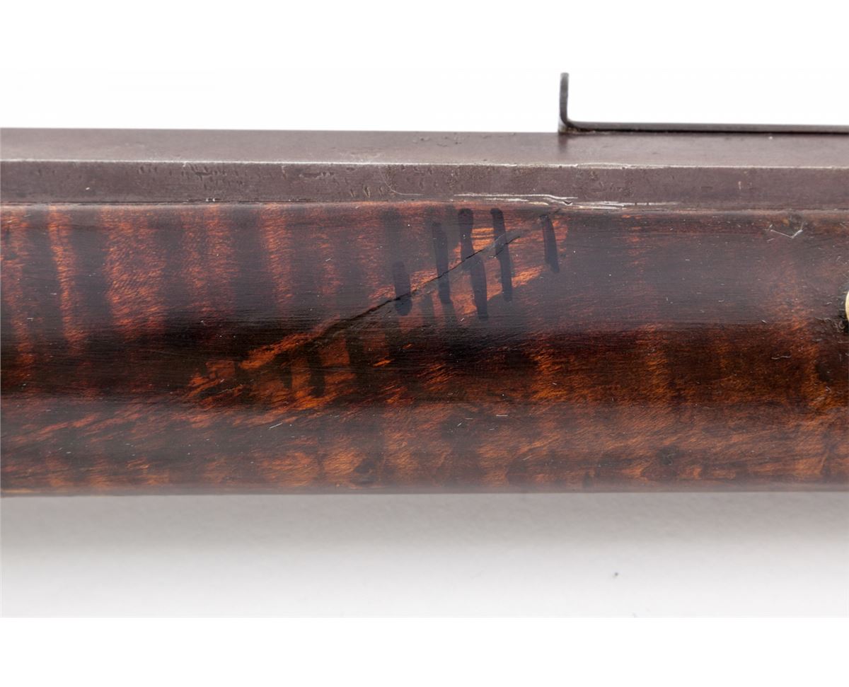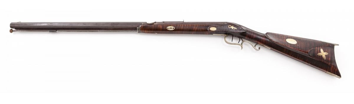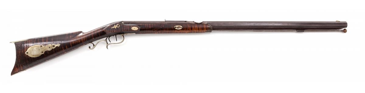 A.J. Plate, San Francisco, Single Shot Flobert-Style Rifle, NVSN, .25 cal., 31-3/4'' octagon barrel, actual rifled section for Flobert use is 20-1/4'', originally brown finish, double set trigger, dark stained maple halfstock, with nickel escutcheons and accents, as well as patchbox to right side of butt. Adolphus Joseph Plate was born in 1818 in West Phalis, Russia, and came to America in 1840. After three fires in his New York furniture business, he fell victim to gold fever in 1849 meeting with moderately good fortune in the mines of San Francisco. In May 1850, he opened a little outdoor gun stand on Long Wharf (now Commercial Street), starting with a small stock of ammunition and second-hand pistols. In 1851 he opened a small store and later added a repair shop. From 1851 to his death in 1878, Platt's firearms were touted for their superior workmanship. He was one of the first to import arms from Europe to the Pacific Coast and built up a prosperous trade from Mexico to British Columbia. In 1859 Platt employed Charles Slotterbek who later gained fame with his modifications to the Sharps rifle. This rifle shows many characteristics of those found on later Slotterbek rifles. Condition is very good. Barrel shows overall moderately toning brown patina. Stock remains in very good condition with several professionally executed repairs. Rear sight may be a later replacement, missing elevator. Set trigger operates as designed. Rifle portion of bore is fine to excellent. Est.: $1,800-$2,400. (Antique)