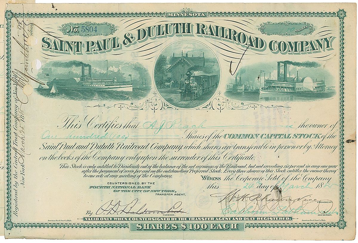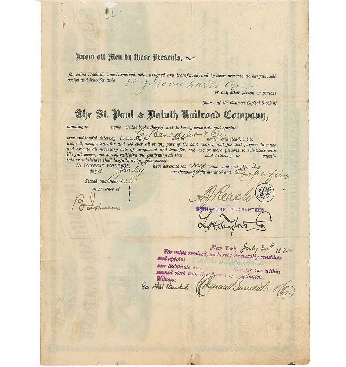 Extremely important baseball pioneer (1840–1928) who became one of the early stars in the National Association, and went on to become an influential executive, publisher, sporting goods manufacturer, and spokesman for the sport. Partly-printed DS, one page both sides, 15.25 x 7.75, March 24, 1885. Stock certificate issued to Reach for 100 shares of common stock in the Saint Paul & Duluth Railroad Company, signed on the reverse in fountain pen by Reach. The receipt is affixed to the left edge of the certificate. In very good to fine condition, with intersecting folds, scattered light toning and soiling, cancellation holes to left edge, and various expected stamps and notations. Accompanied by an internal receipt from the railroad company. Reach is quite difficult to find in any form.