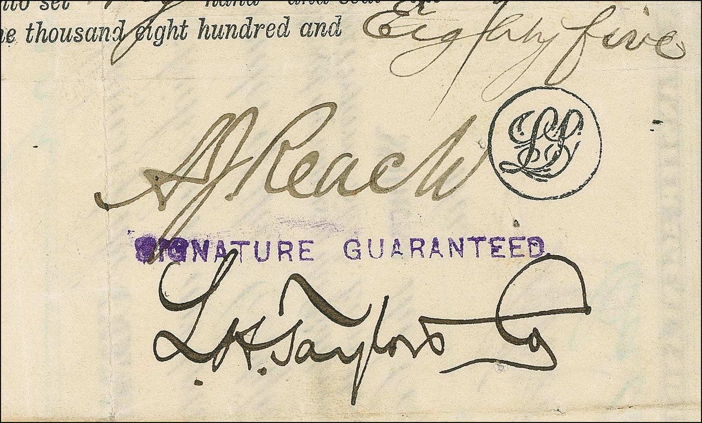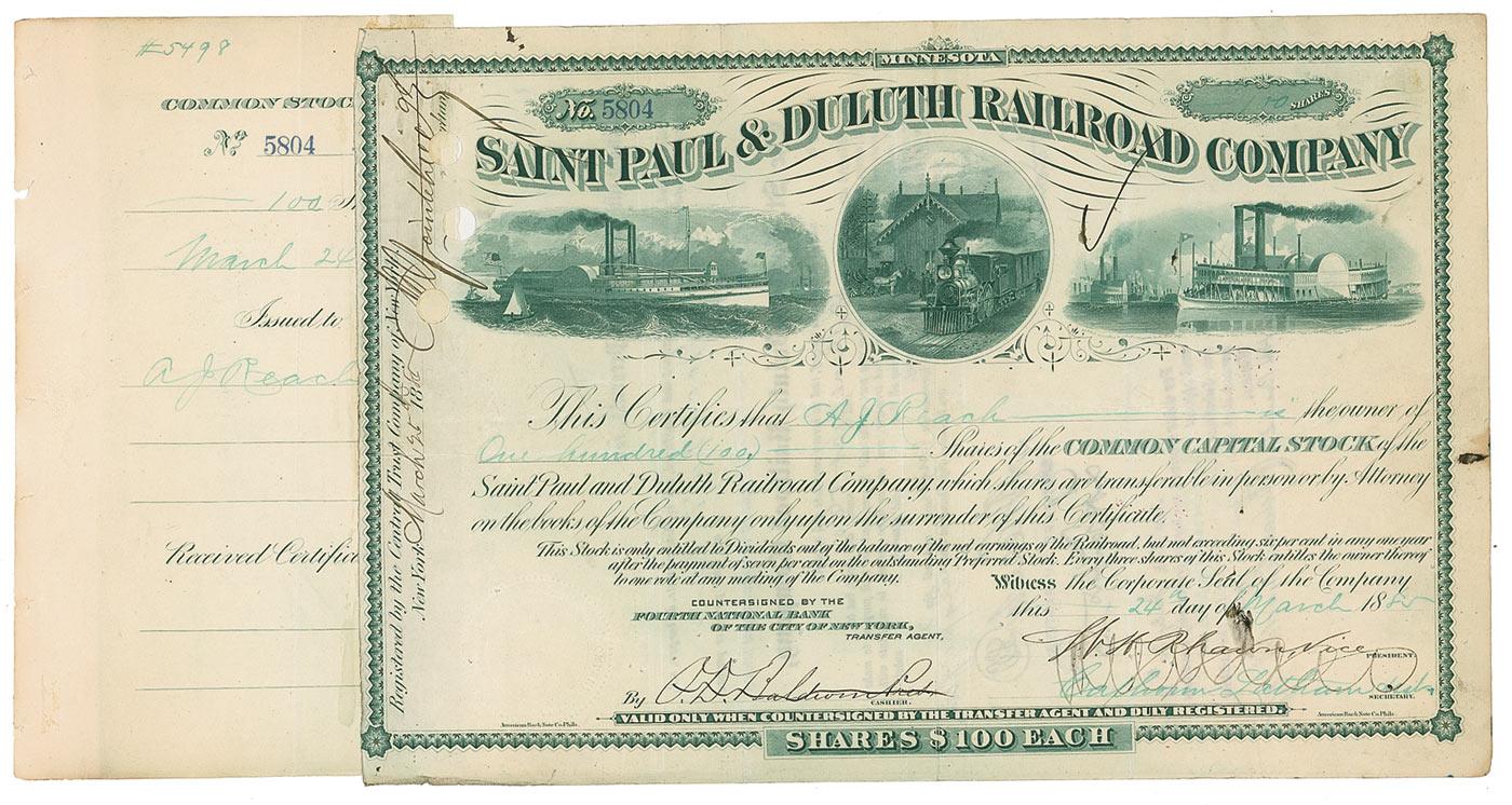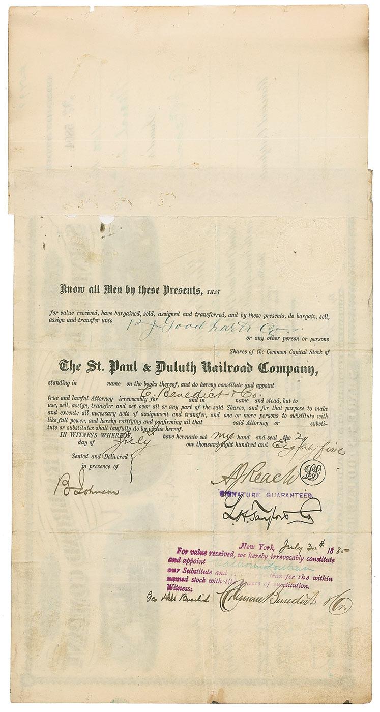Sportsman who, after becoming one of the early stars of baseball in the National Association, went on to become an influential executive, publisher, sporting goods manufacturer, and spokesman for the sport. Upon his retirement from playing in 1875, he helped found the Philadelphia Phillies franchise. Partly-printed DS, one page both sides, 15.5 x 8, March 24, 1885. Stock certificate issued to Reach for 100 shares of common stock in the Saint Paul & Duluth Railroad Company, signed on the reverse in fountain pen by Reach. The receipt is affixed to the left edge of the certificate. In very good condition, with three vertical folds, scattered light toning and soiling, punch holes to left edge, and several other stamps and signatures.