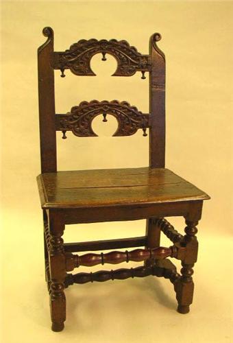A JACOBEAN CARVED OAK LANCASHIRE-TYPE CHAIR; English, with a volute-and-leaf-carved back above a plank seat and turned legs, some repairs