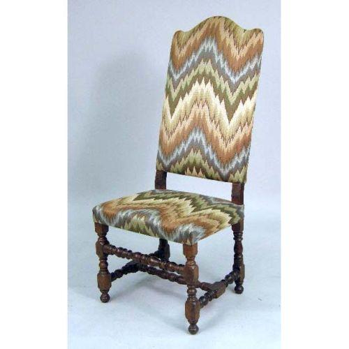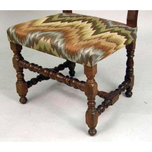 A JACOBEAN STYLE FLAME-STITCH UPHOLSTERED TURNED WALNUT BACKSTOOL<BR><BR>English, one foot spliced, some other wear, 48 1/2"h
