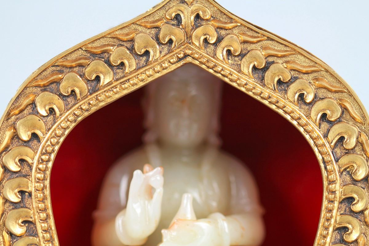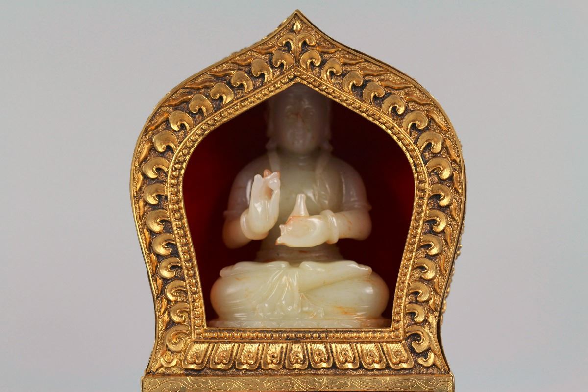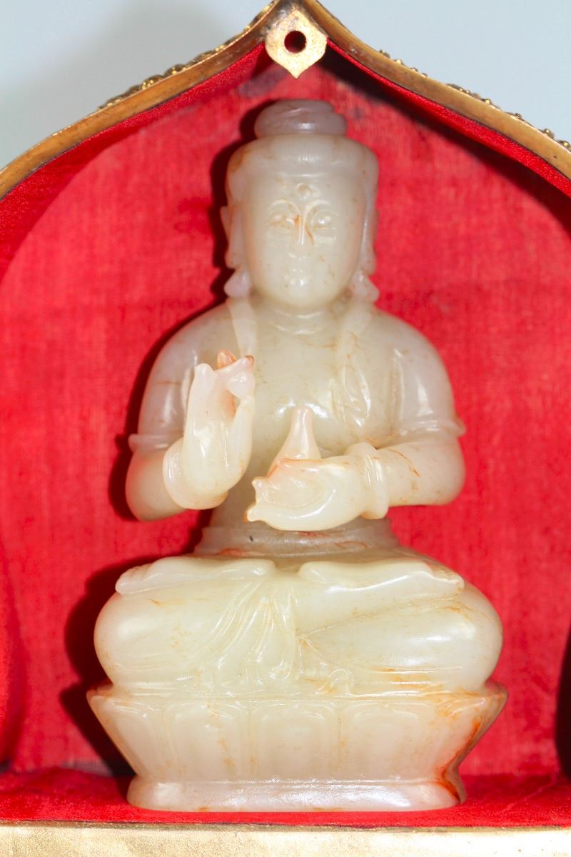 A seated Buddha statue carved in a meditation posture, hair tied up in one knot, eyes slightly closed with lip coners uplifted in serene expression, wearing a flowing rpbe, worshiped in a gilt niche with exquisite craftmanship and a wooden base. Height 11.5"
