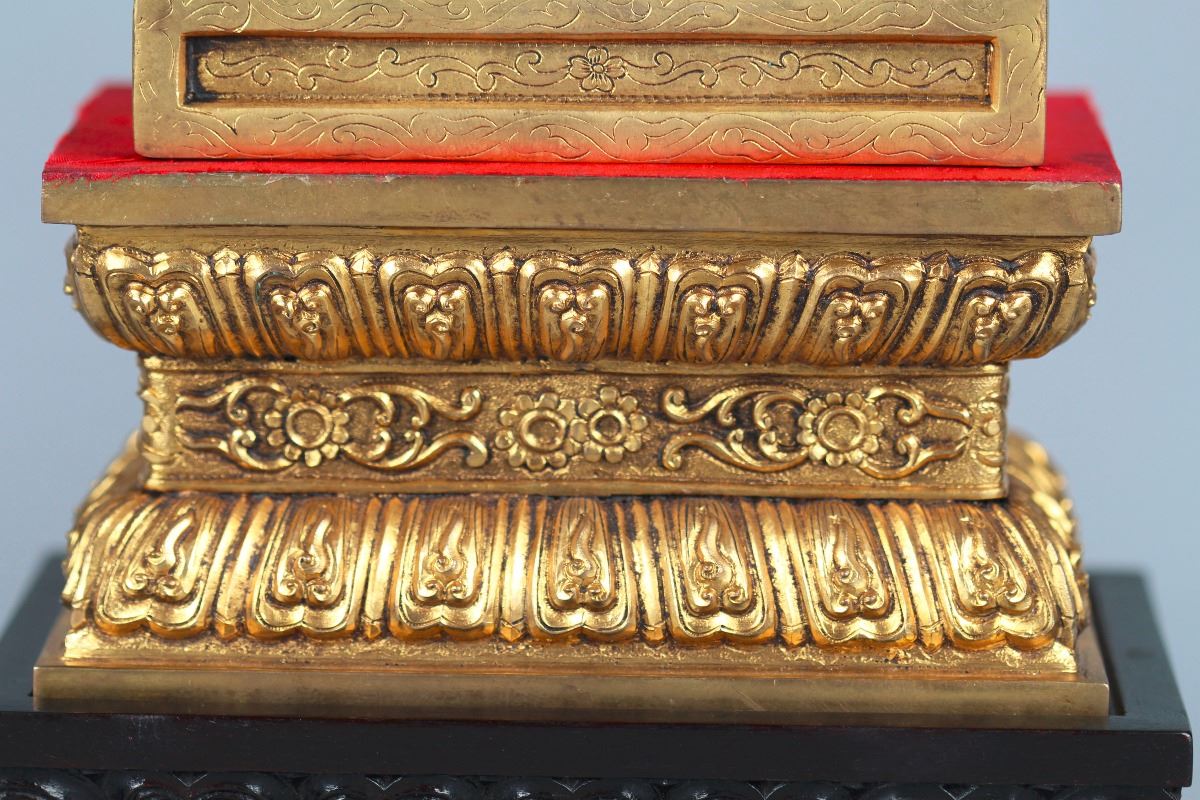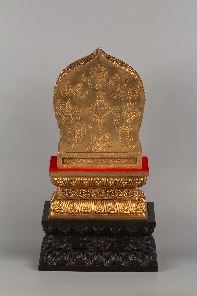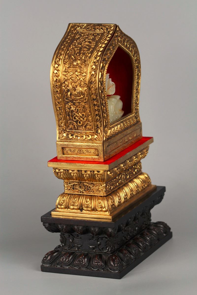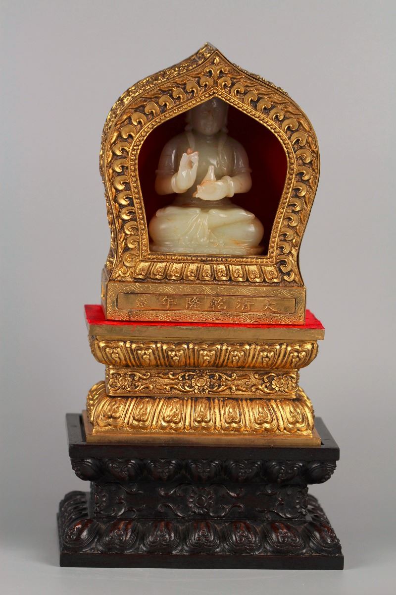 A seated Buddha statue carved in a meditation posture, hair tied up in one knot, eyes slightly closed with lip coners uplifted in serene expression, wearing a flowing rpbe, worshiped in a gilt niche with exquisite craftmanship and a wooden base. Height 11.5"