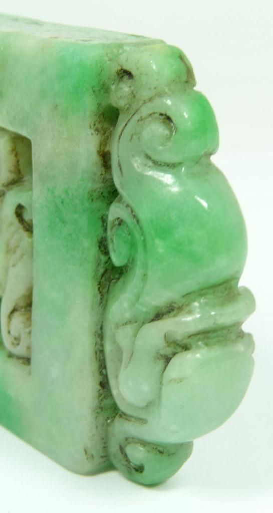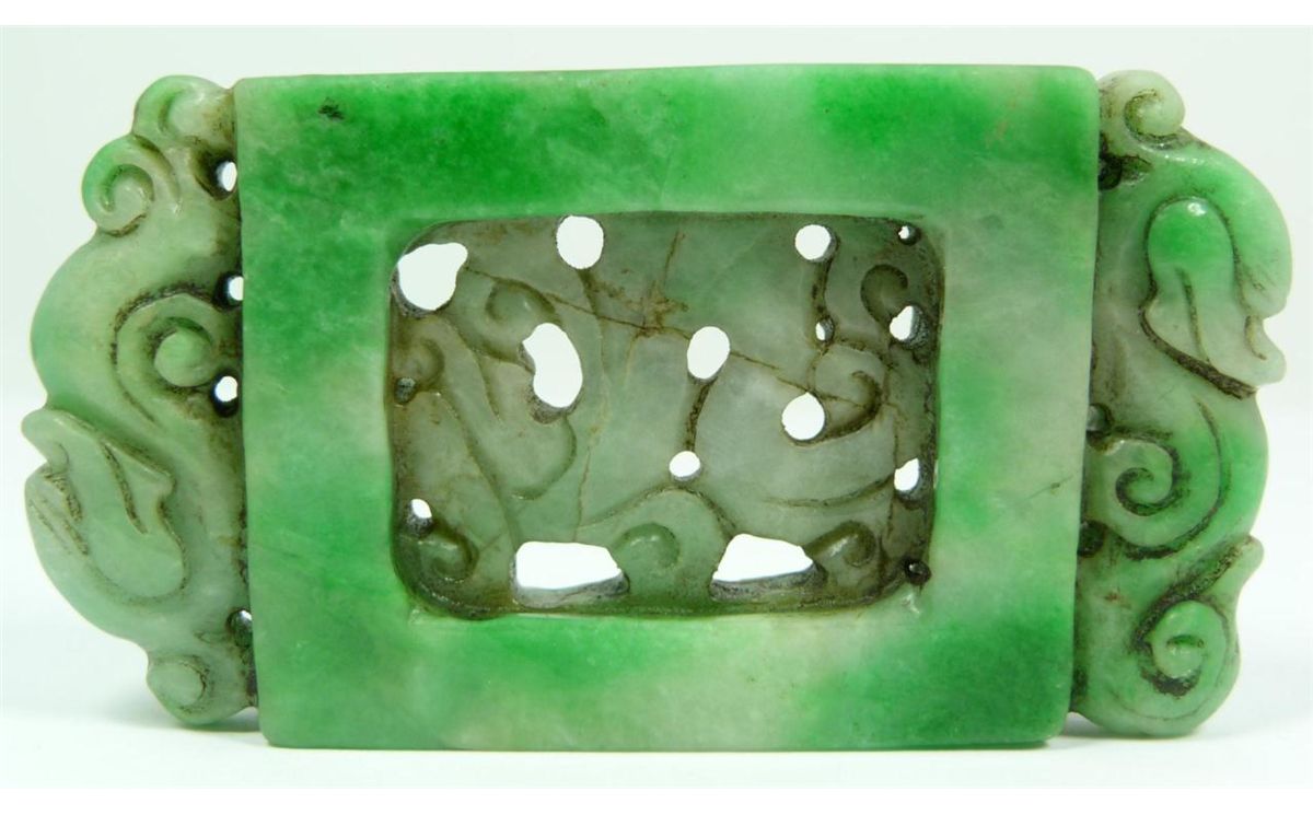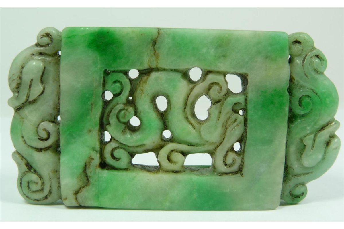 A large and heavy jadeite reticulated rectangular plaque pendant depicting Chih lung dragons. Mottled white and apple green jadeite colors. Measures 3 3/4" height x 2" width x 1/2" depth (9.5cm x 5.1cm x 1.2cm). Total weight of 138 grams.