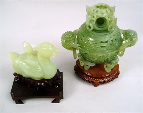 A JADEITE CARVED FIGURAL OF DUCK, together with a carved jadeite incense burner on stand, largest, 7"l