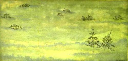 A JAPANESE-STYLE WATERCOLOR AND INK ON LINEN; depicting trees in a foggy landscape, signed l.r. Gene Charlton 56. Verso with the label Madrid/Macarron S.A./Jovellanos 2. 12" x 24 3/4"