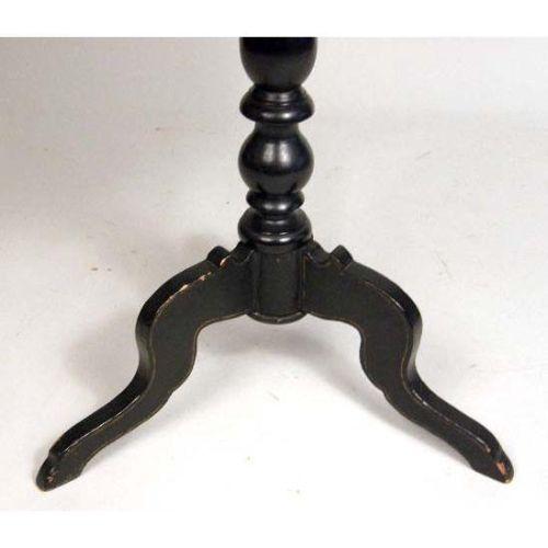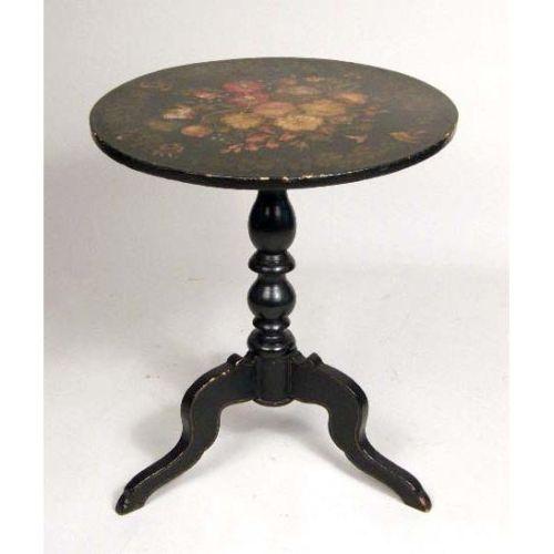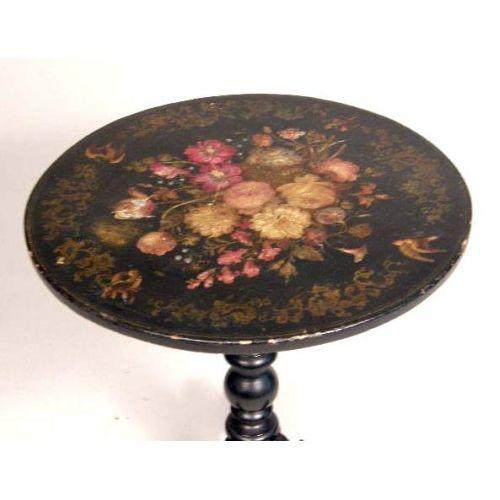 A JAPANNED VICTORIAN TILT-TOP BIRDCAGE TEA TABLE<BR><BR>the top painted with flowers, birds and scrollwork. 28 1/2" high x 25 1/4" diameter.