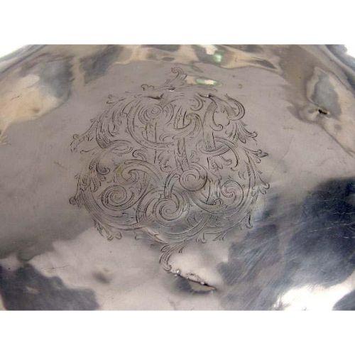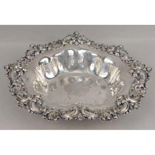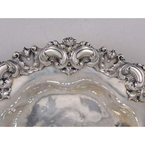A JE CALDWELL, PHILADELPHIA STERLING SILVER CIRCULAR CENTERPIECE BOWL<BR><BR>With central monogram, scalloped rim with heavy shell and floral molded border, 16" diameter, weight apx. 30 T.O., repair and losses