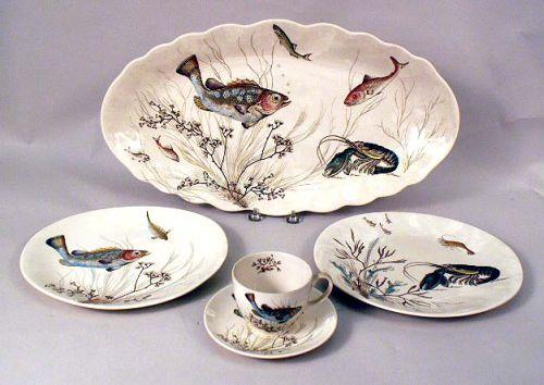 Fish pattern, comprising twelve oval dinner plates, eighteen cups and saucers, and an oval platter.