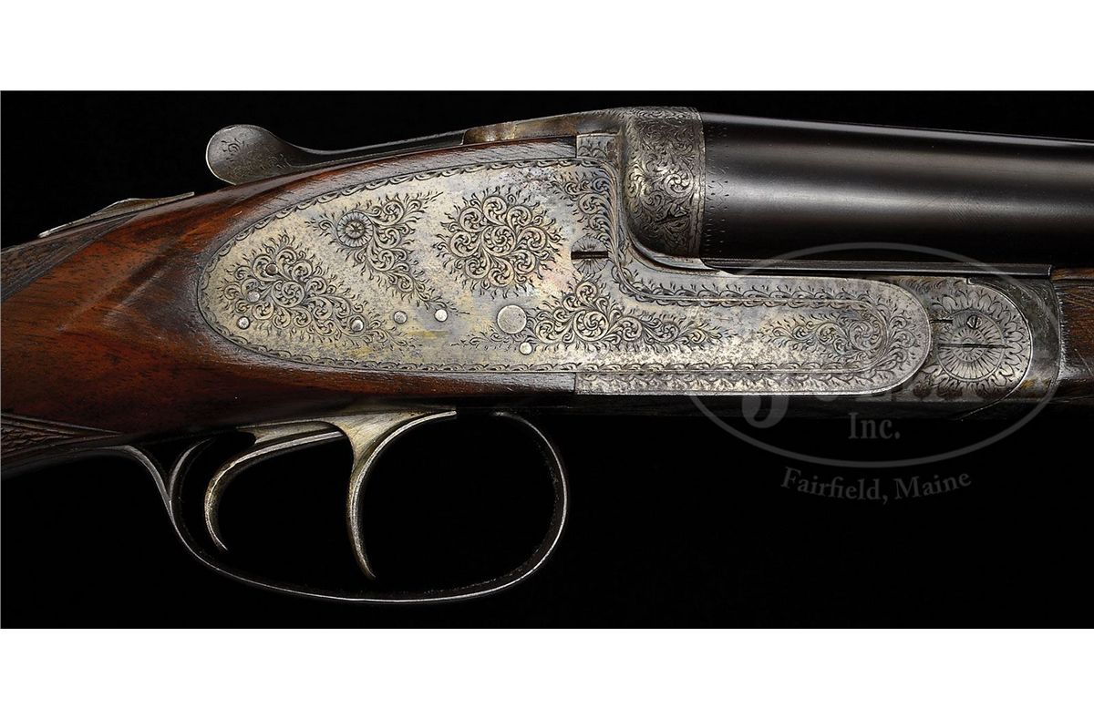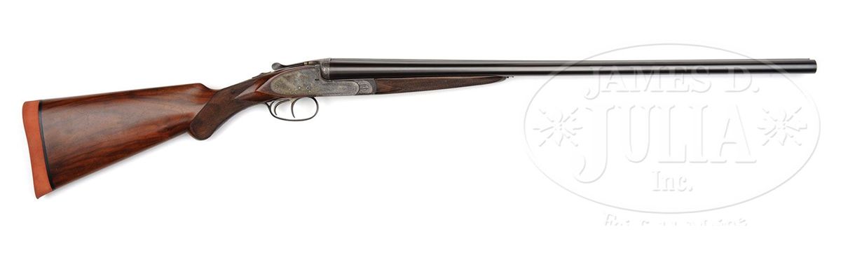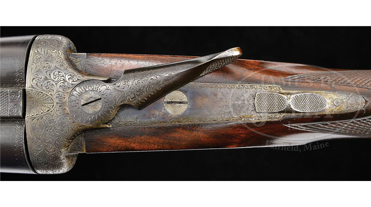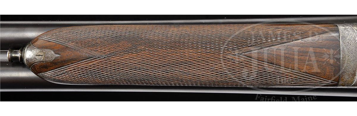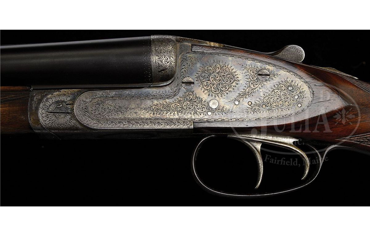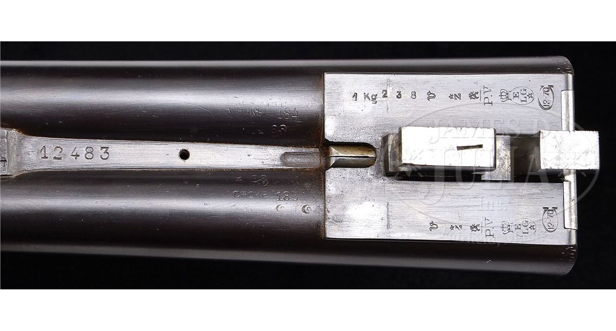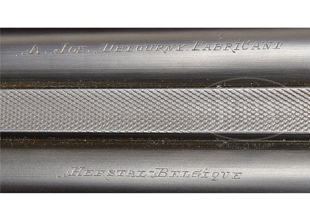 SN 12483. Cal. 12 ga. 2-3/4" Chambers. 26-3/4" Chopper lump bbls with matted, concave game rib, are engraved "A. Jos. Defourny Fabricant" and "Herstal - Belgique" on tops. Bbl flats are stamped with Belgian nitro proofs for 2-3/4" chambers. Case hardened, square-backed action is fitted with back action sidelocks with intercepting sears. Action also features non-automatic safety (S engraved), bushed strikers, Purdey type hidden third fastener, and double triggers. Action is engraved with about 80% coverage medium scroll. Trigger guard has scroll on bow, and SN at grip. Streaked European walnut round knob, semi pistol grip buttstock measures 14-3/4" over Silver type pad. 18 LPI point pattern checkering has mullered borders. Matching splinter ejector forend has Anson release. Bore diameter: left-.724, right -.722. Bore restrictions: left -.009 (IC), right -.002 (Skeet). Wall thickness: left -.030, right -.028. Drop at heel: 2-7/16", drop at comb: 1-3/8". Weight: 6 lbs. 14 oz. LOP: 14-3/4". CONDITION: Very fine, as partially refinished and repaired. Bbls retain nearly all of a satin re-blue, engraving slightly softened. Action and lockplates retain most of their case hardening color with considerable spotting, flecking, and fading to gray brown. Stocks retain most of an old oil finish, checkering re-cut, pad new. There is a repaired crack (about 2-1/2") running from rear of trigger guard bow on both sides, back into body of stock, which flexes slightly. Bores are very fine, slightly frosted. Action is tight. Bbls are on face. Ejectors are slightly out of time.ÊÊ 4-48914 MGM218