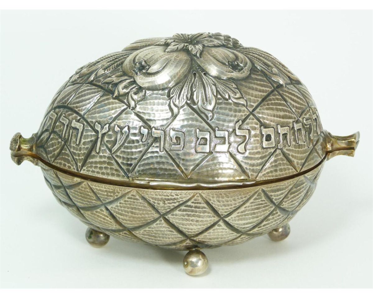 A Judaica .835 silver figural etrog form hinged footed box. Repousse design having fruit to top of cover and Hebrew calligraphy. Gold wash interior. Marked 835 with impressed harlequin or jester in cartouche hallmarks. Measures 4 1/8" height x 6 1/2" length x 4 1/4" depth (10.4cm x 16.5cm x 10.7cm). Total weight of 12.39ozt.
