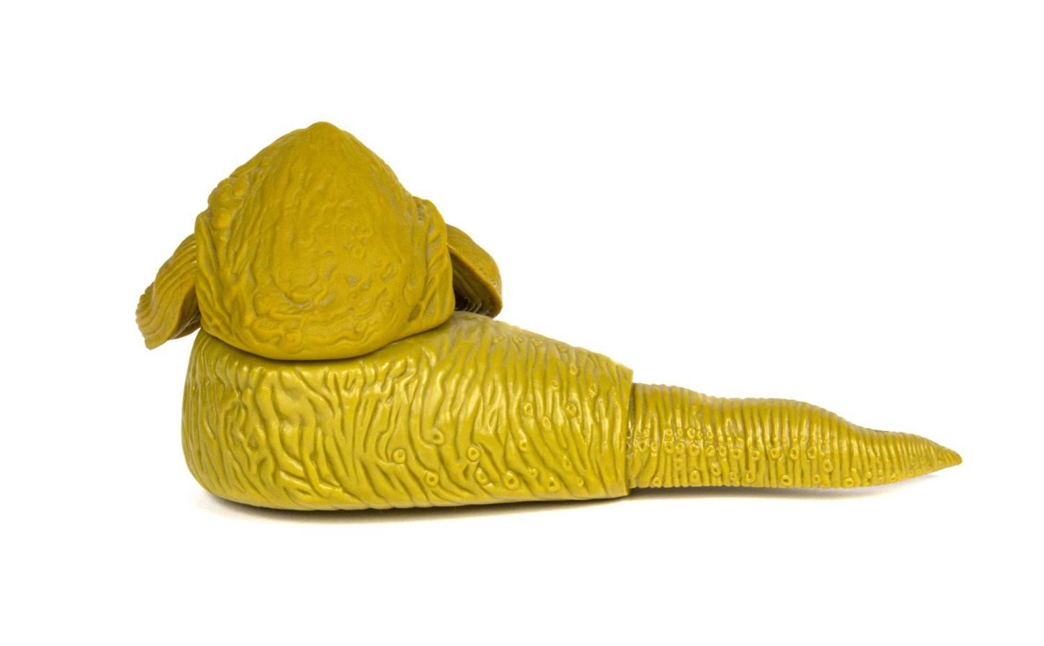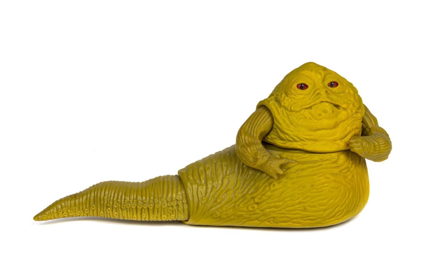 (Kenner, 1983) An original Jabba the Hutt action figure from Kenner’s “Return of the Jedi” toy line. This was the first figurine of Jabba ever produced, originally part of a set that included a throne, a hookah, and a Salacious Crumb figure. The articulated figure’s tail swings by rotating the head. Measuring 3.25” x 9.5” x 4.5” tall, the plastic figurine displays in very good condition with light stickiness to the arms from age.