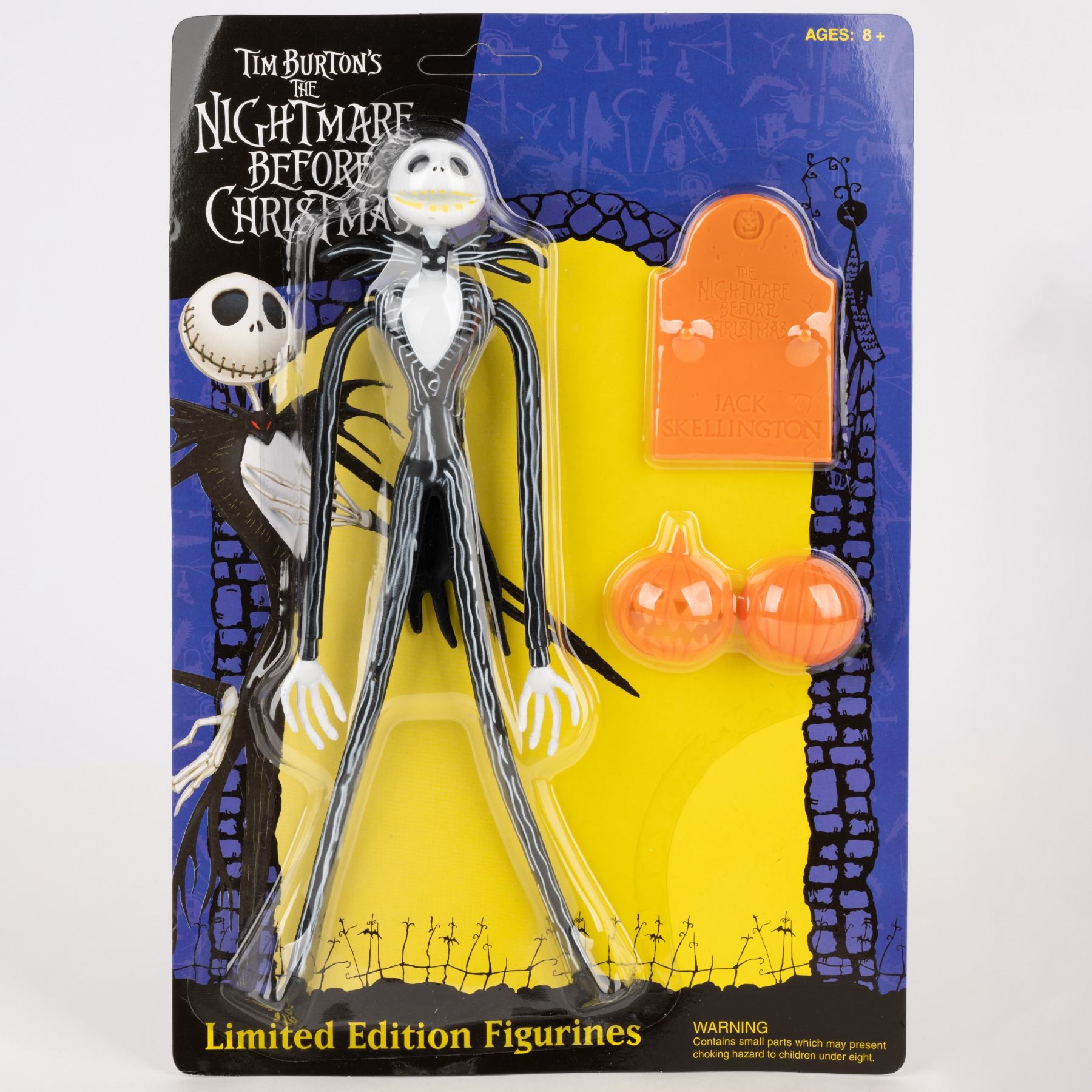 (NECA, 1990s-2000s) An action figure of Jack Skellington from "Tim Burton's The Nightmare Before Christmas." The figurine was released in an unnumbered limited edition of 15000 by NECA and comes with a gravestone and two pumpkin accessories. The 3.5" x 1" and 9" tall figurine is in fine condition sealed within the original 7.5" x 1" x 11" packaging.
