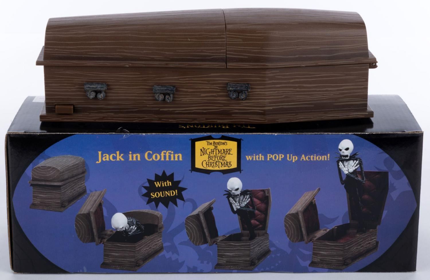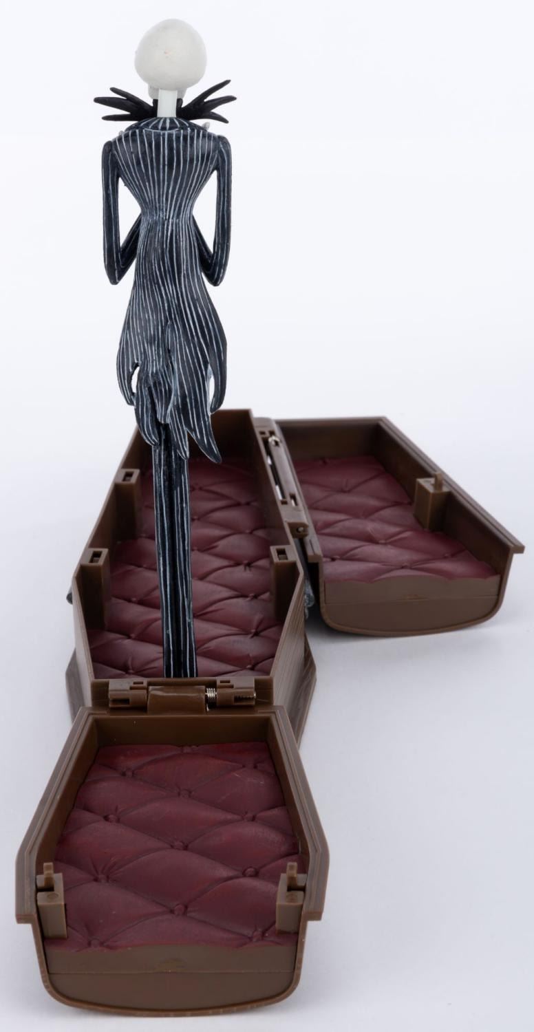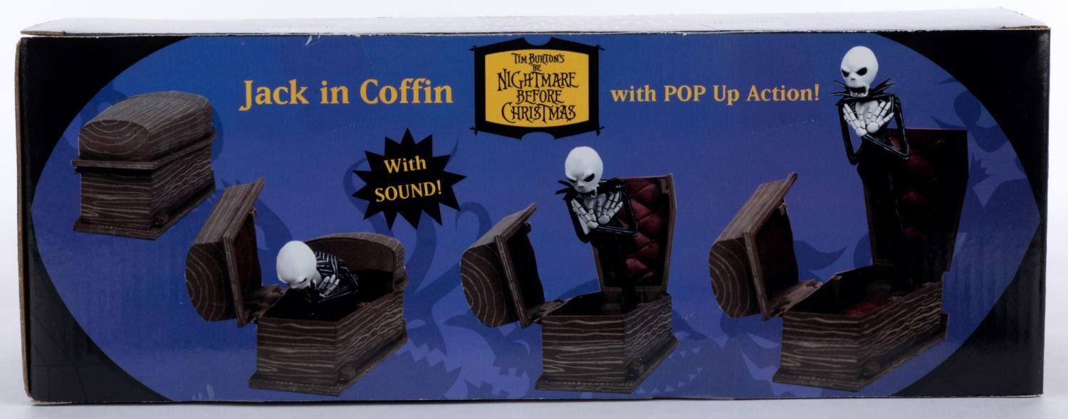 (NECA, 2004) A pop-up figurine featuring Jack Skellington from "Tim Burton's The Nightmare Before Christmas." When the button on the bottom left corner is pressed Jack pops out of the coffin to let out an unearthly howl. Measuring 9" x 3.25" and 3" thick closed, the figurine is in fine condition and comes in the original 11" x 4" x 4" box. Three 357A batteries are required (not included).