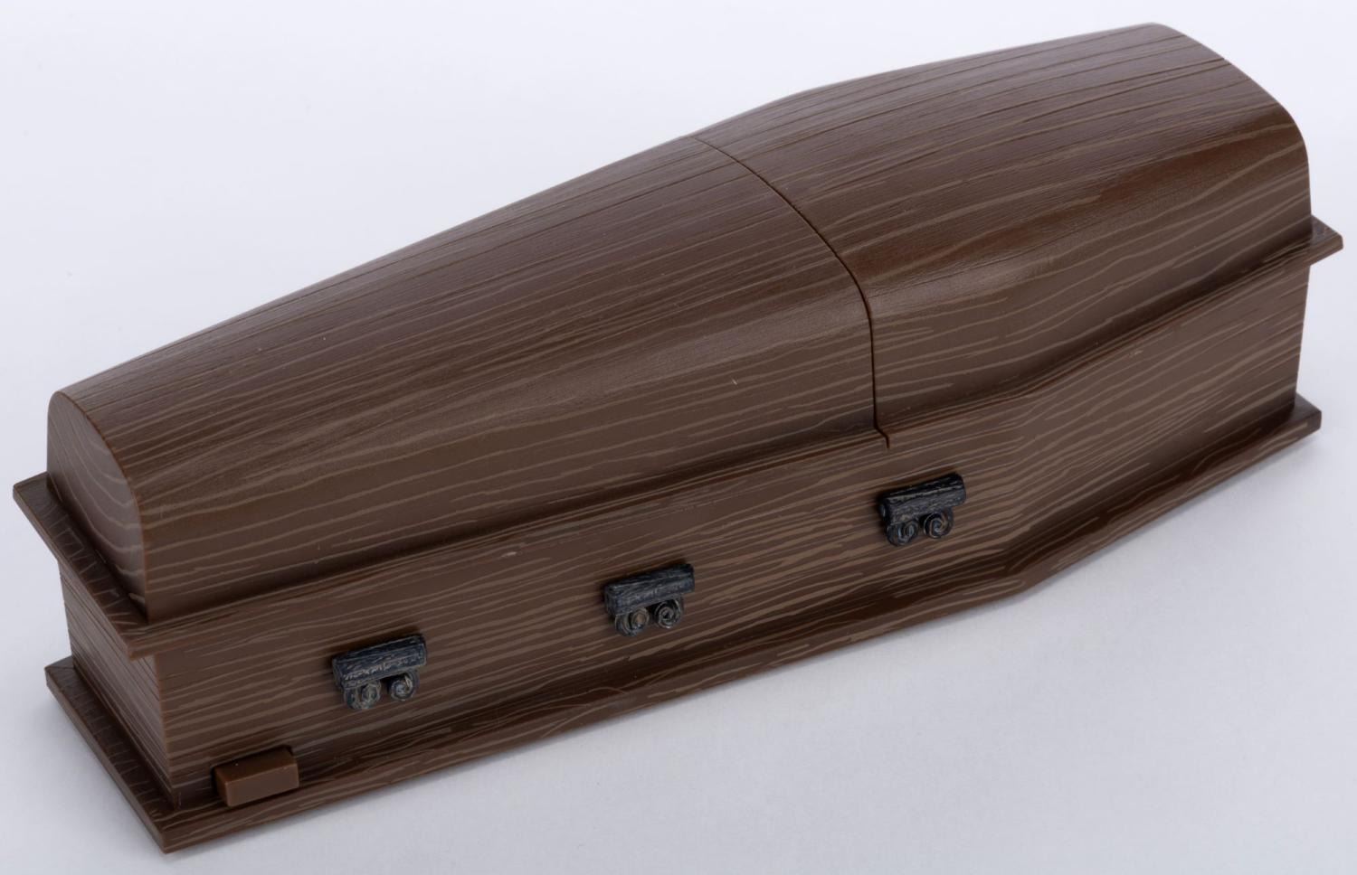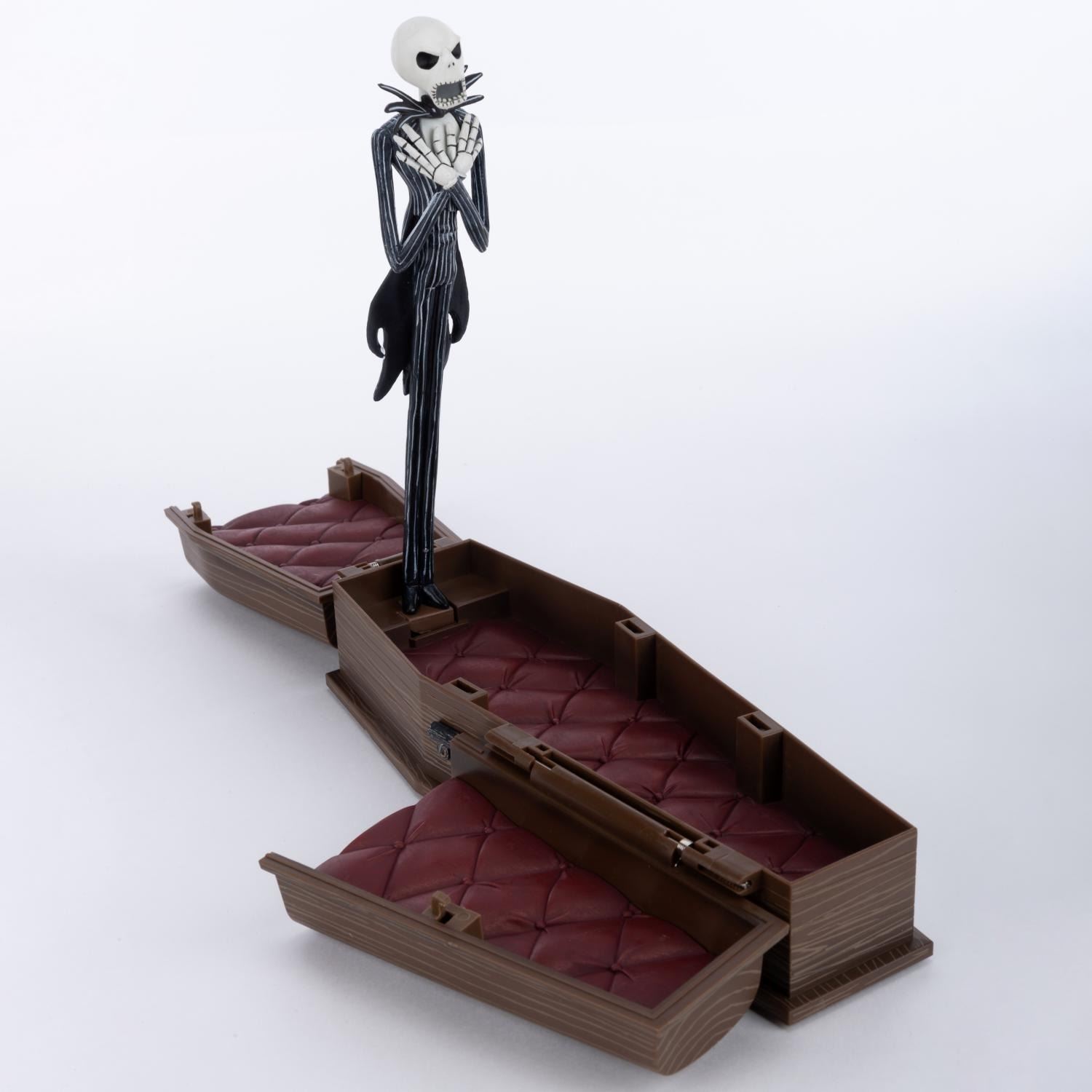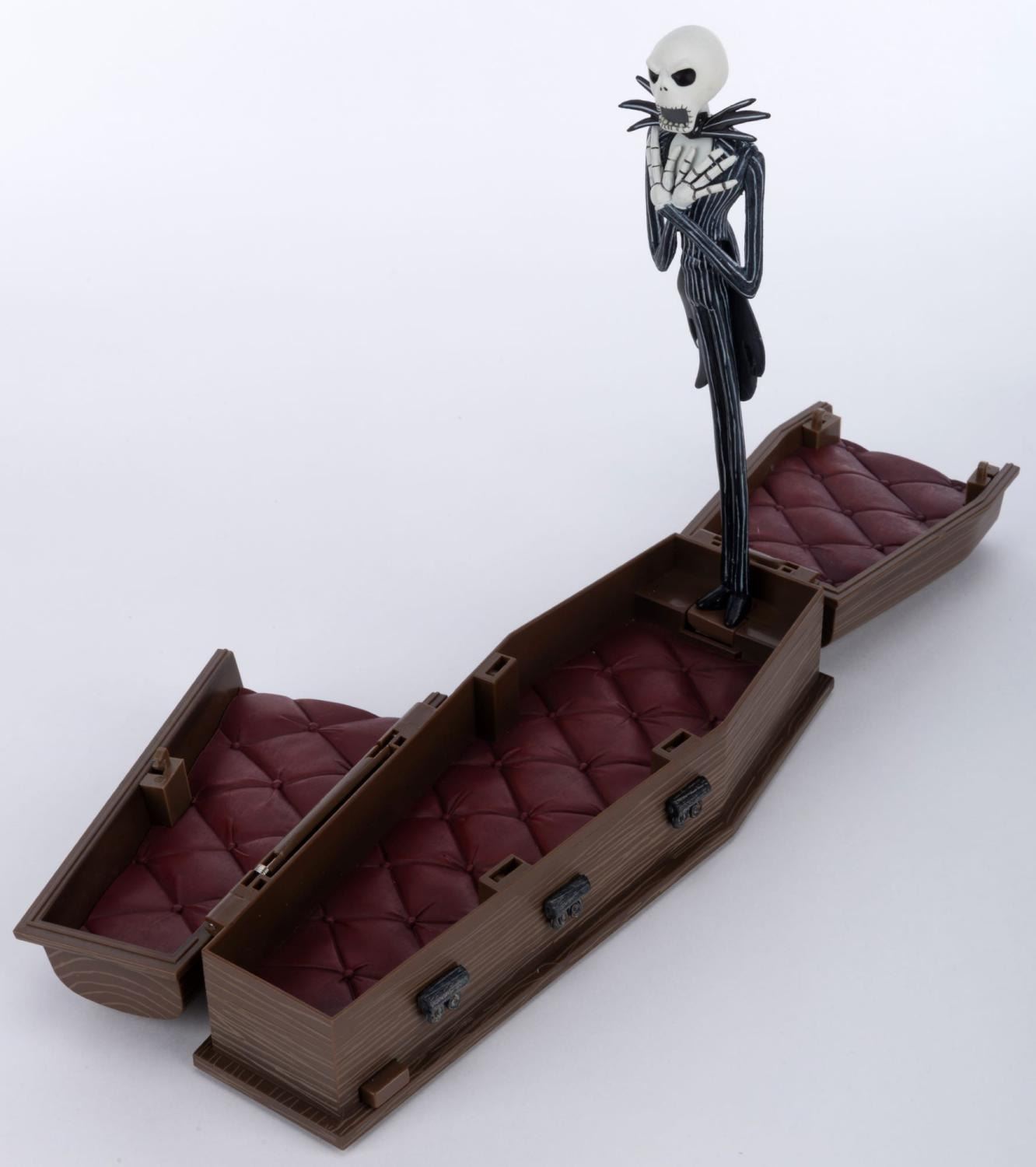 (NECA, 2004) A pop-up figurine featuring Jack Skellington from "Tim Burton's The Nightmare Before Christmas." When the button on the bottom left corner is pressed Jack pops out of the coffin to let out an unearthly howl. Measuring 9" x 3.25" and 3" thick closed, the figurine is in fine condition and comes in the original 11" x 4" x 4" box. Three 357A batteries are required (not included).