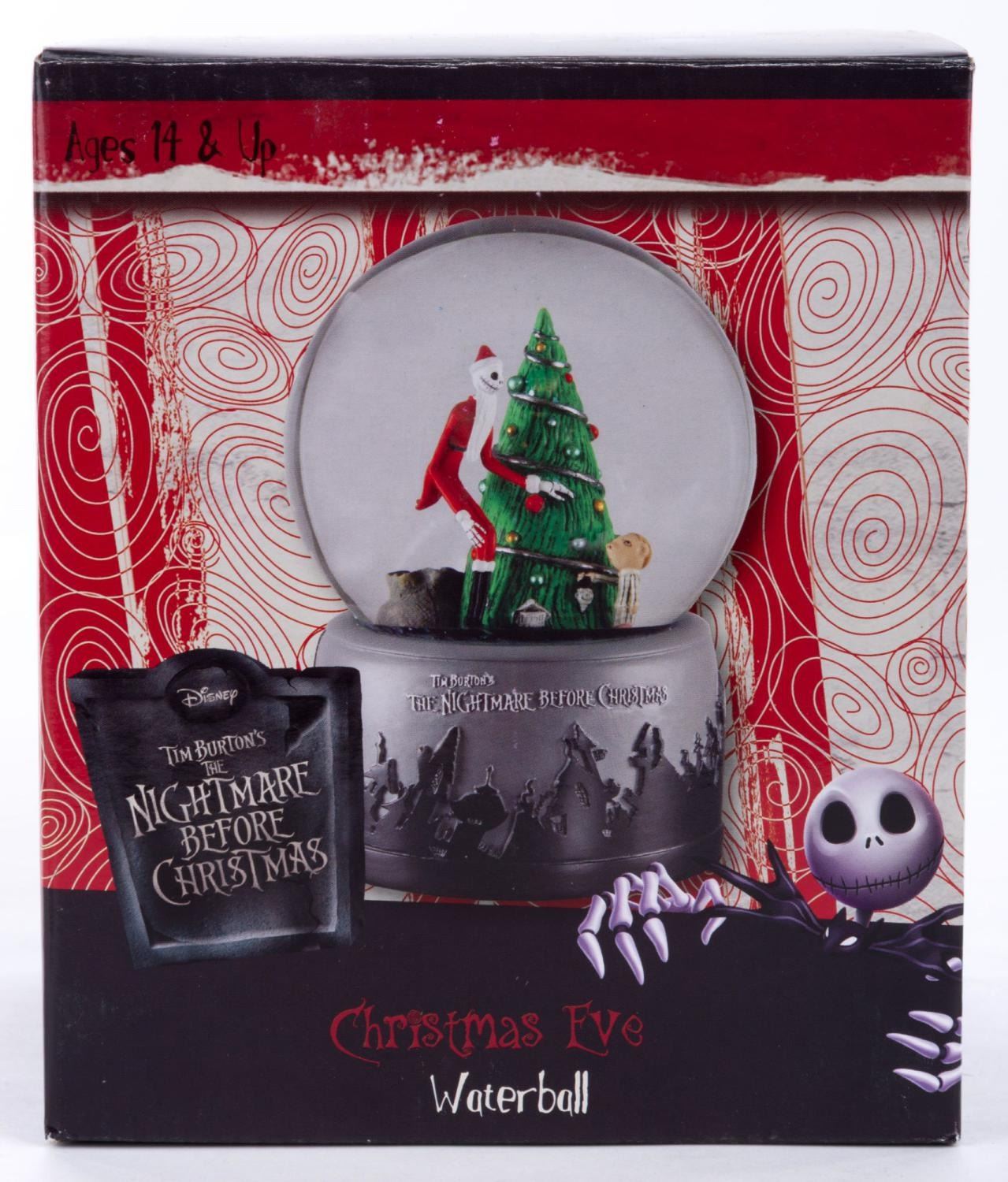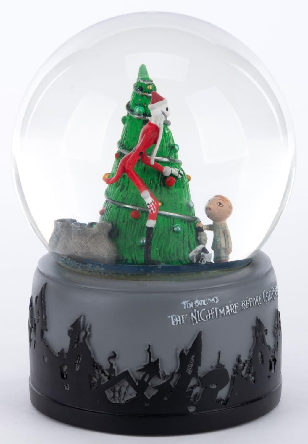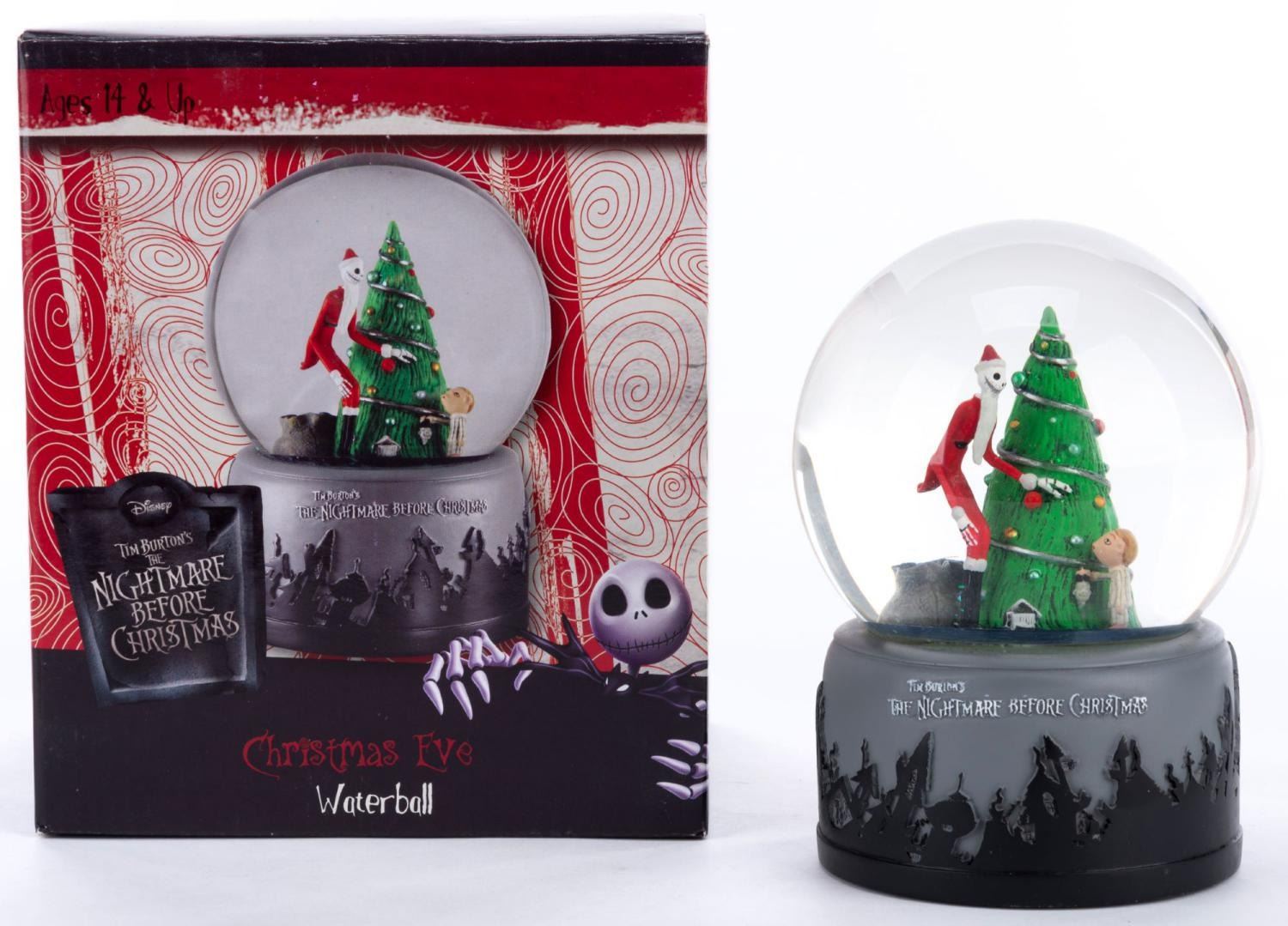 (NECA, 2011) A snow globe with Jack Skellington as "Sandy Claws" and Timmy from "Tim Burton's The Nightmare Before Christmas." Measuring 4" in diameter and 5.5" tall, the hand-painted snow globe is in fine condition and comes with the original 6" x 5.25" x 7" box.