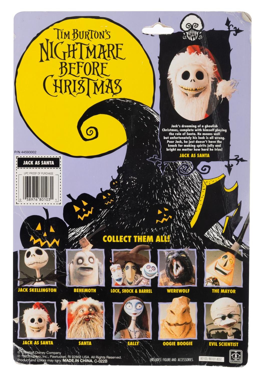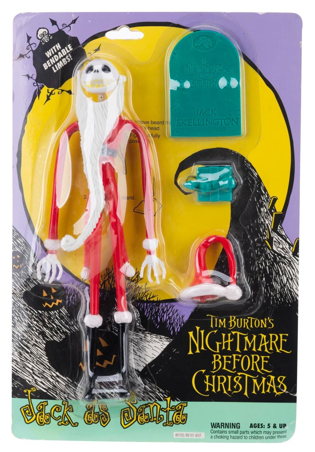 (NECA, 1990s-2000s) An action figure of Santa Jack Skellington from "Tim Burton's The Nightmare Before Christmas." The figurine was released in an unnumbered limited edition of 15000 by NECA and comes with a gravestone and a present accessory. Measuring 7.75" x 11.5" the figure is in fine condition with the card in fair condition with heavy creasing, edge wear and bent corners.