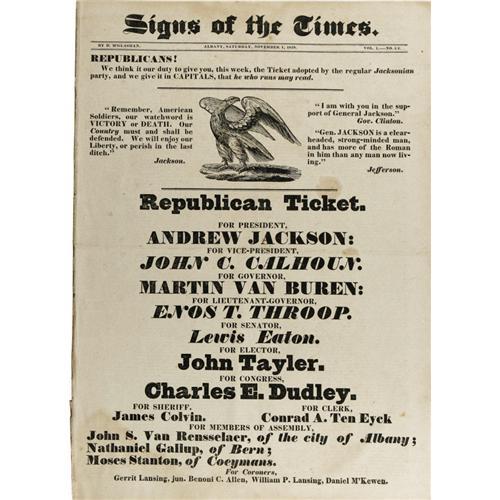 <B>Andrew Jackson: A Bold and Dramatic Large Campaign Broadside From the 1828 Election.</B></I> It also features vice presidential candidate John C. Calhoun and New York gubernatorial candidate Martin Van Buren. While this ticket prevailed, Calhoun would split with Jackson over states' rights, and Van Buren would become his vice presidential running mate in 1832. The bold graphics are supplemented by small quotes praising Jackson from former New York Governor Clinton and the late Thomas Jefferson. Note that these candidates present themselves as the "Republican Ticket." At that time the political descendants of Jefferson still claimed that appellation, being the more "radical" of the parties. In 1854 a new party emerged from the ashes of the disintegrated Whigs. These Free-Soilers were the new radicals on the political scene, and they appropriated the term and titled themselves the Republican Party. The present broadside is actually the front cover of a four- page newspaper extra, published by "Signs of the Times" in Albany, New York. It was a common practice for newspapers of that era that were usually weeklies to issue special "extra" issues for important topics which arose during the week. This one, dated November 1, 1828, obviously was a last push for the political ticket supported by the paper's publishers. This is the complete edition in excellent condition. There are several extremely minor smaller water stains and an almost undetectable horizontal fold line. Overall terrific display appearance. It is printed on heavy rag paper, of a thicker grade than one customarily finds on newspapers even of this era, which undoubtedly has contributed to its fine state of preservation. If the masthead is matted out, it displays as a large and impressive early political broadside. If this piece were a blank-back broadside, it would be worth at least several times our estimated value. We have always been puzzled by most hobbyist's practice of automatically valuing posters and broadsides which have printing on the back and/or were issued by newspapers at much less than what the identical item would bring if it were a conventional blank-back issue. The present item is probably as scarce as the other broadsides of that election, and displays every bit as well. In our opinion, it presents a great value at this price level. Dimensions: 14" x 20".<BR><BR><b>Shipping:</b> Miscellaneous Collectibles, Smal (<a target="_blank" href="http://www.heritageauctions.com/common/shipping.php">view shipping information</a>)