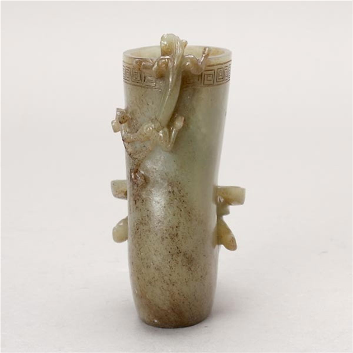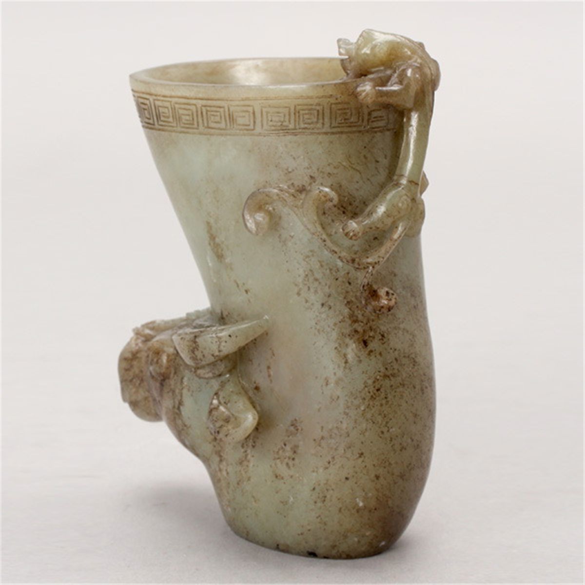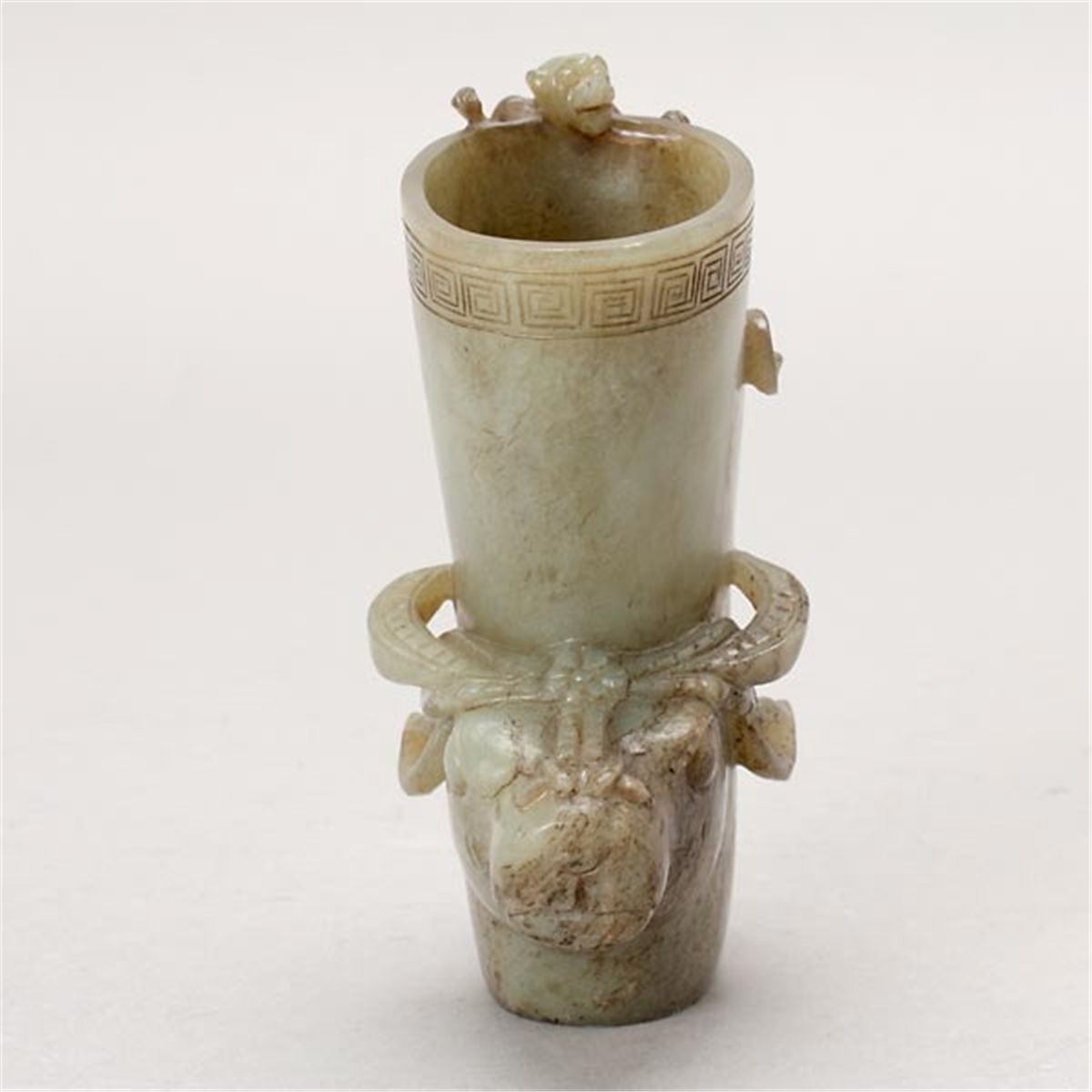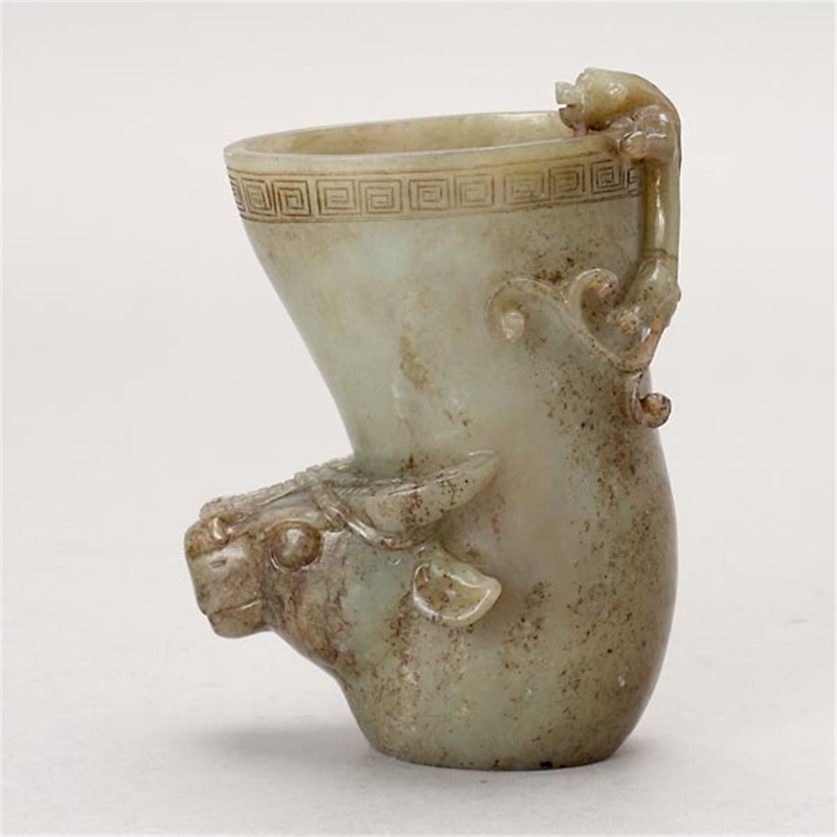 A Jade Libation Cup, Carved as an ox head with a chilong dragon clinging to the cup's mouth and featuring a key-fret band to the mouth rim, the stone of grayish celadon tone with dark brown inclusions, with wood stand. Height: 4 3/4 inches (12.1 cm) [Surface soiling. This condition report states major condition issues only.]