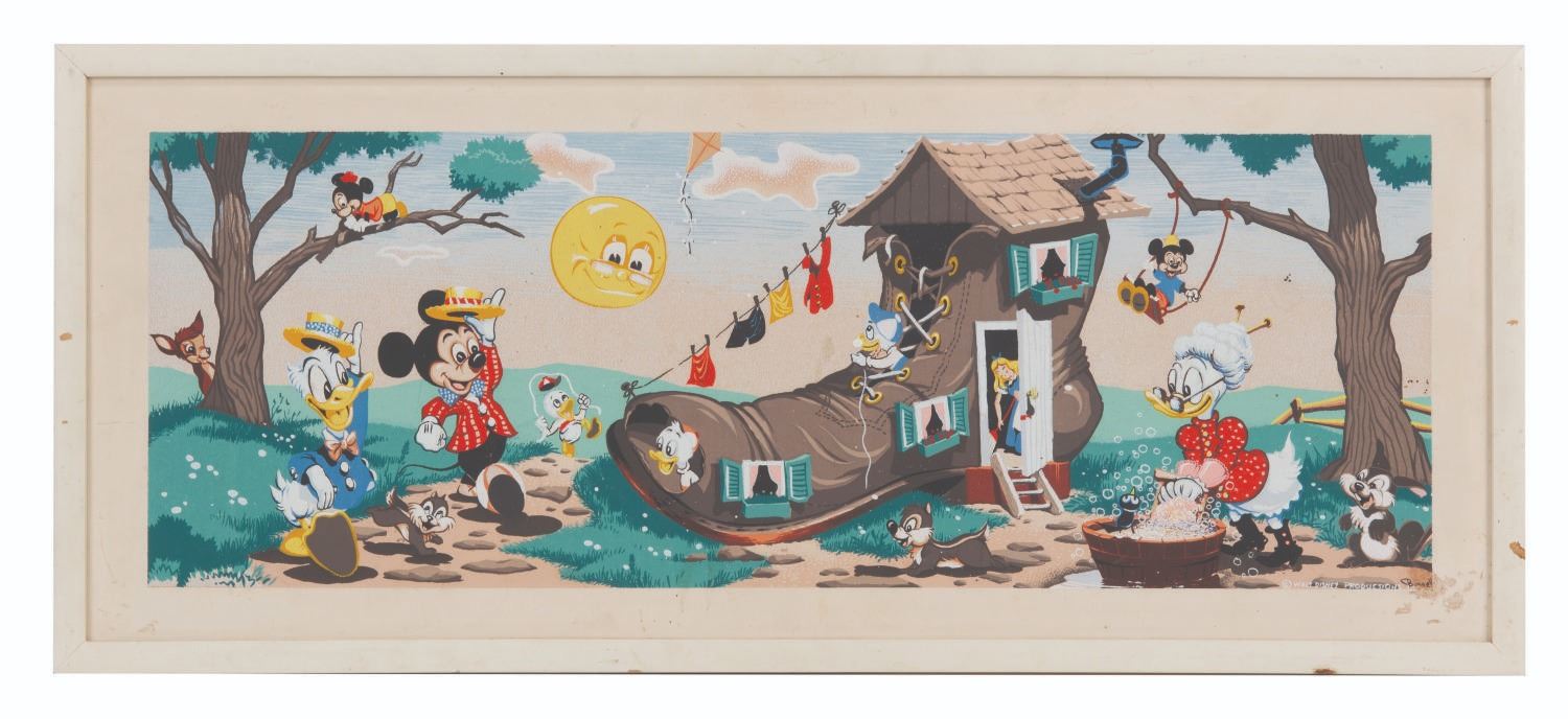 (Disney, 1957) A serigraph print by artist James Bunnell depicting Disney characters in the fairy tale "The Old Woman Who Lived in a Shoe." Mickey Mouse and Donald greet Grandma Duck as their nephews and other Disney characters play nearby. An original label on the back identifies this as a "Hand Painted Silk Screened Econolite Art Creation" from Los Angeles.