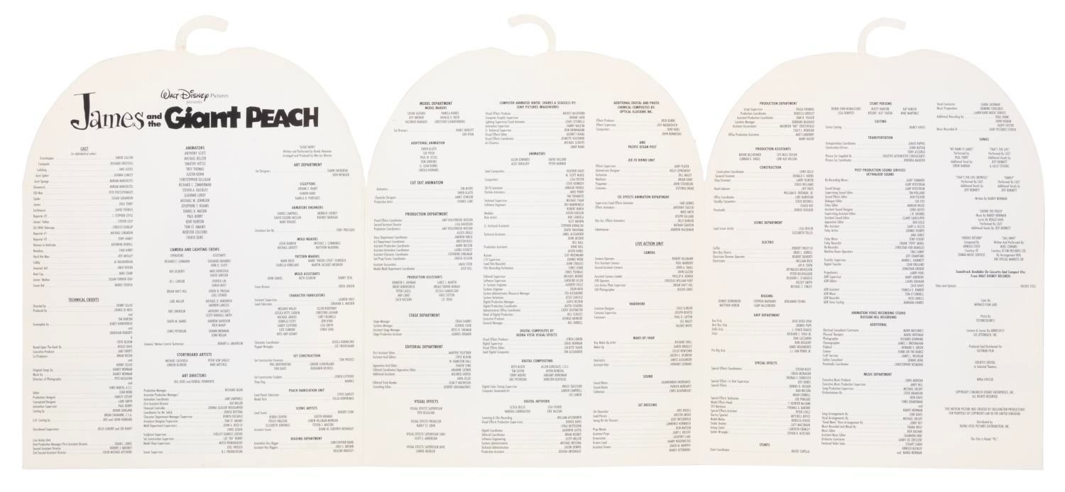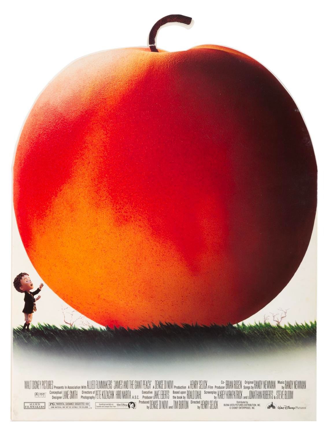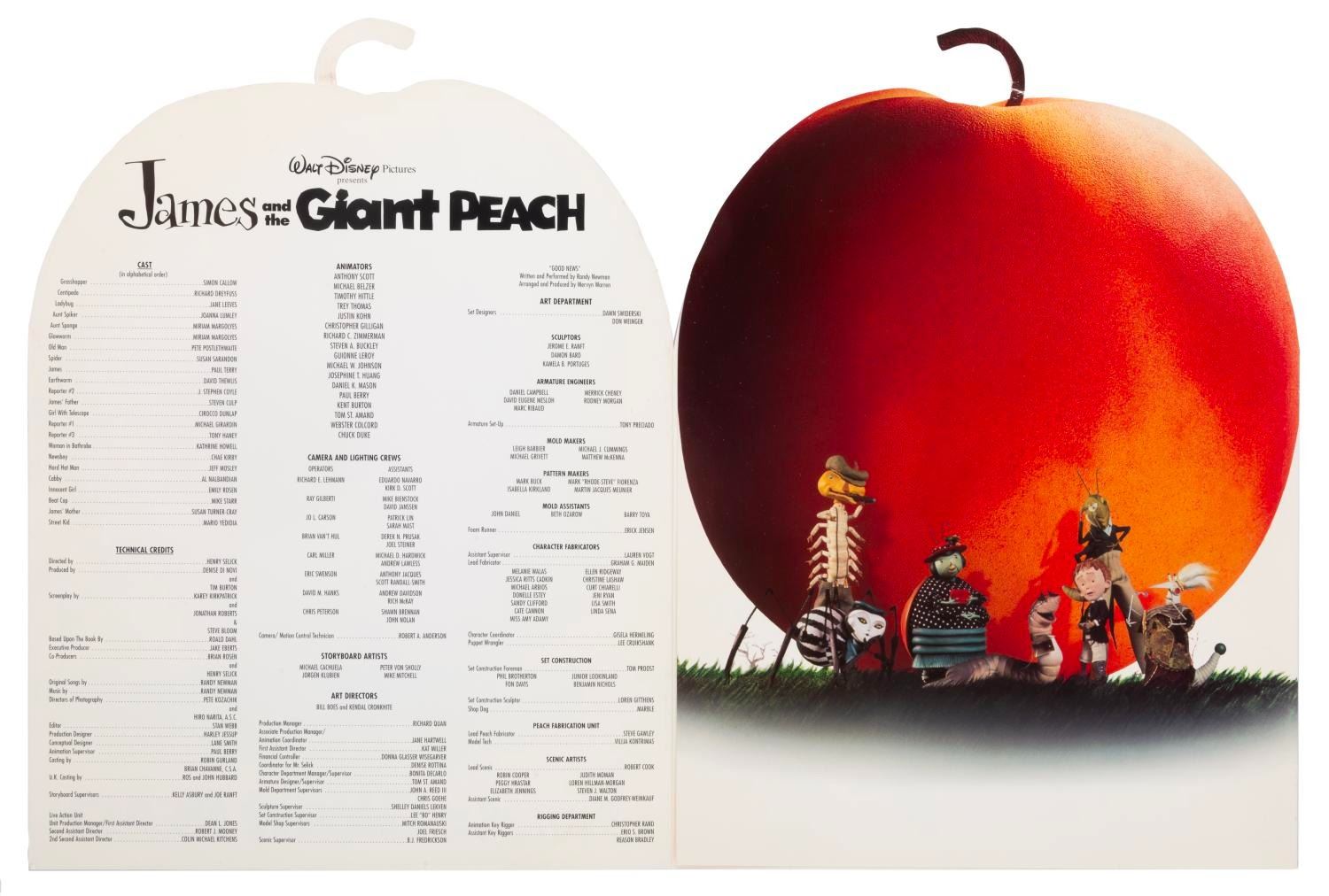 (Disney, 1996) A screening program for"James and the Giant Peach." Measuring 9" x 12" the program is in good condition with light wear, and creasing to the die-cut peach stem at the top.