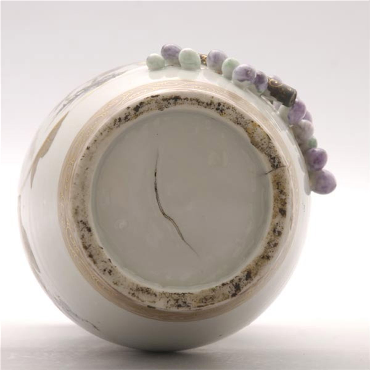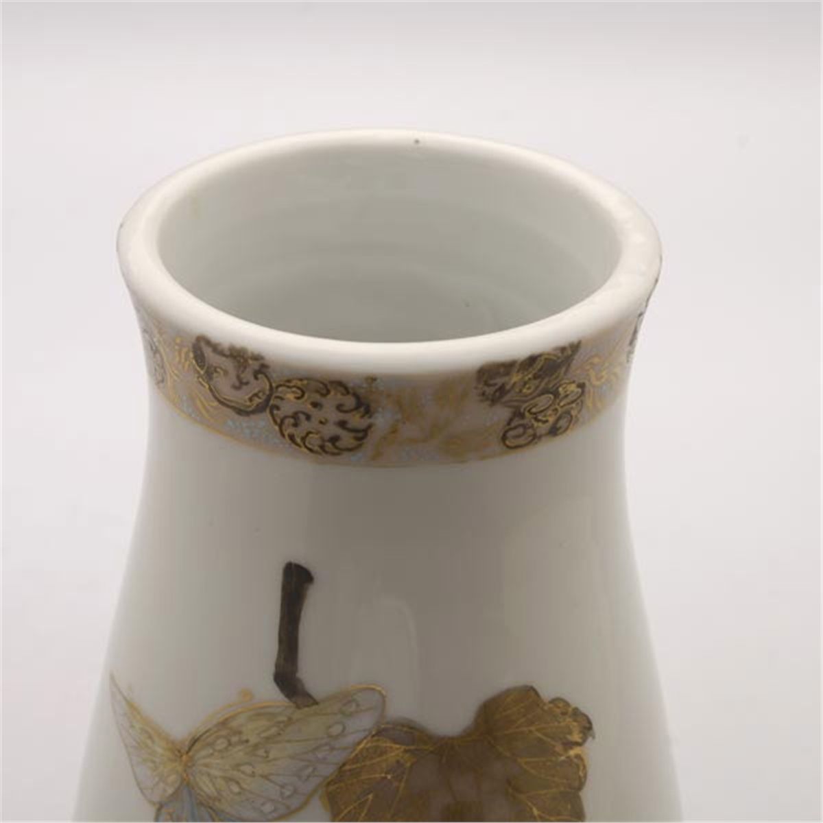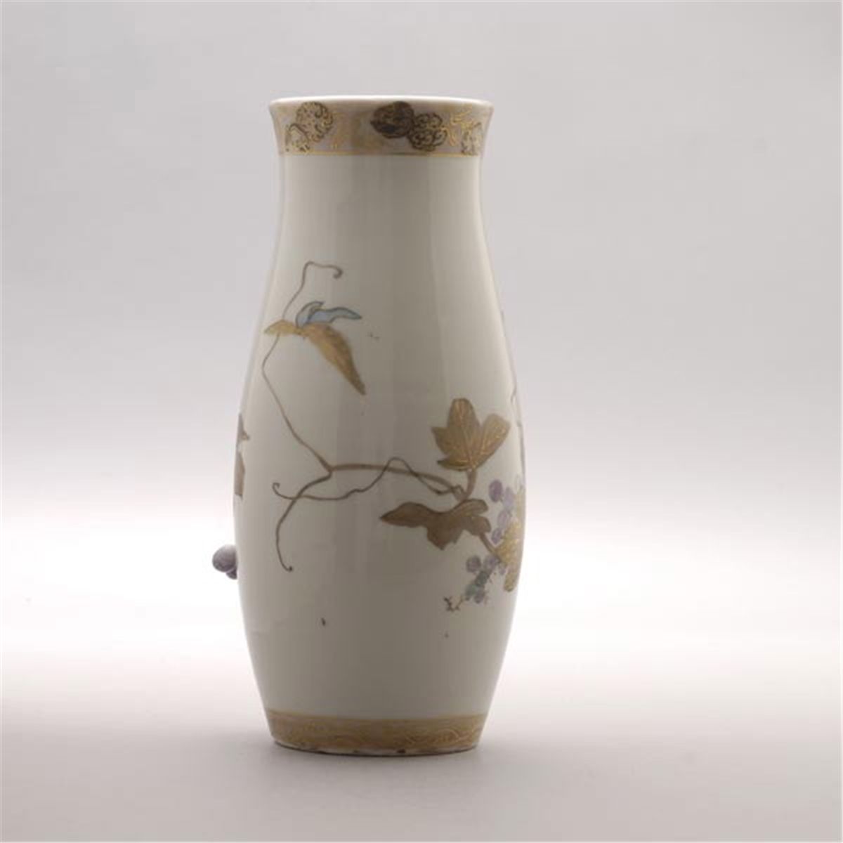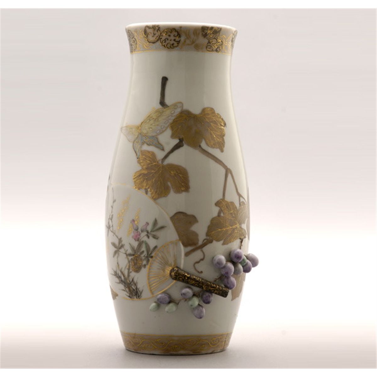 A Gilt and Enamel-Decorated Porcelain Vase, Of swollen cylindrical form, depicting grapes, butterflies and a circular fan decorated with a fruiting pomegranate tree, below a gilt-painted phoenix band and above a gilt-painted scrolling band. Height: 12 1/8 inches (30.8 cm)