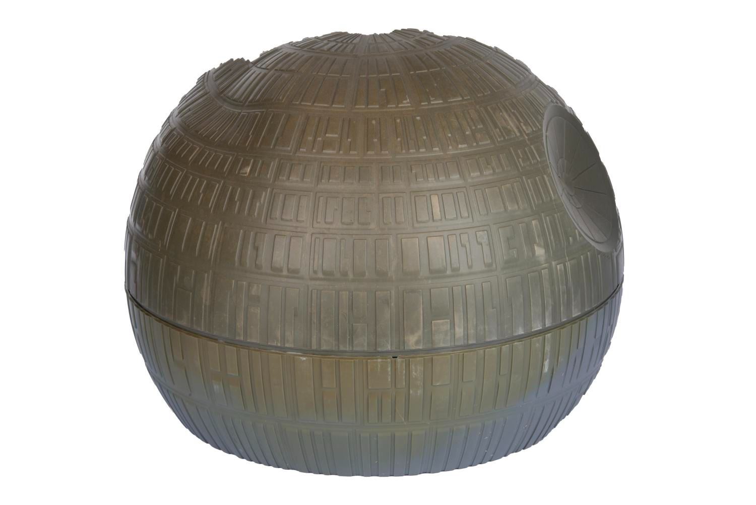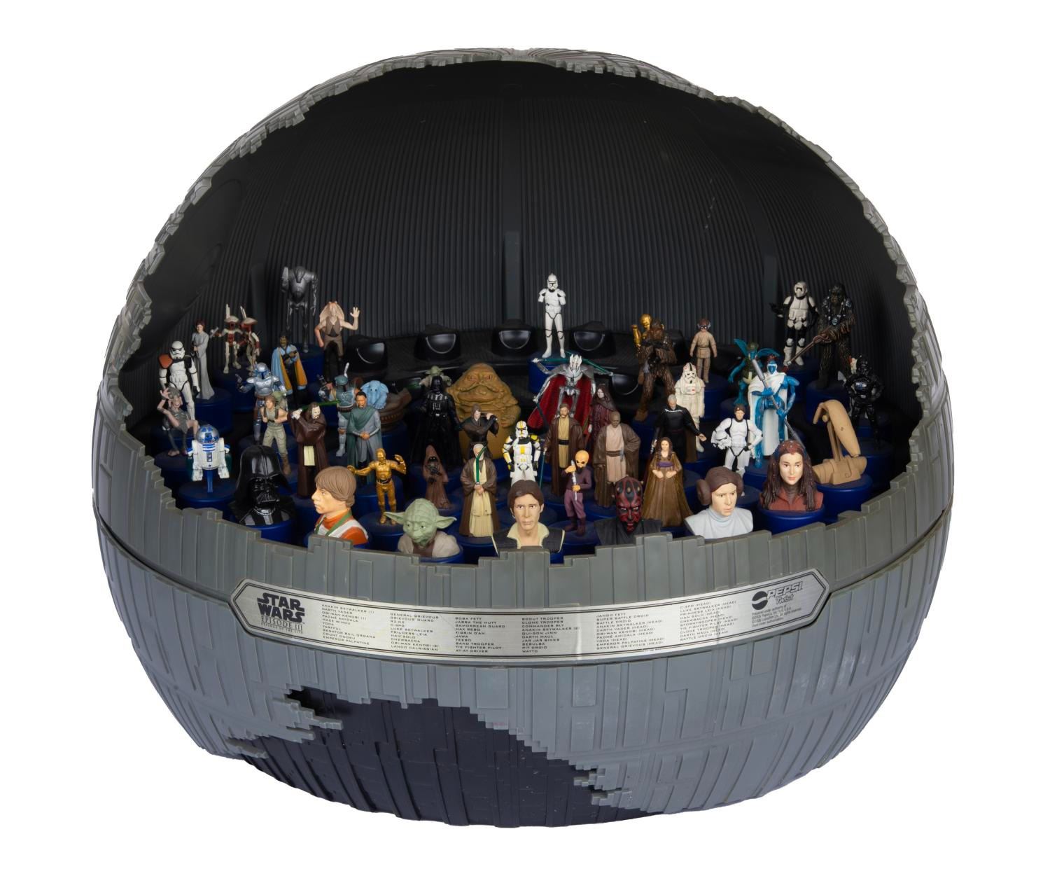 (Pepsi/Lucasfilm, 2005) A Pepsi Twist Star Wars Death Star "Stage" with 50 figures. The figures were released for purchase on stands designed to look like blue Pepsi bottle caps. (50) of the 60 available figures are included, although (2) figures are broken with all pieces present. The stage measures 18" in diameter and 14" high, and all are in good condition with some wear from handling and display, including a slight warp to the back of the Death Star canopy.