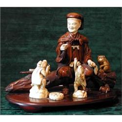 A Japanese carved ivory and hardwood figure group depicting a man seated on a...