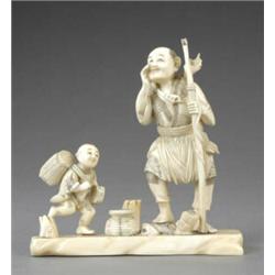 A Japanese ivory carving of a peasant and running boy, - A Japanese ivory carving of a peasant a...