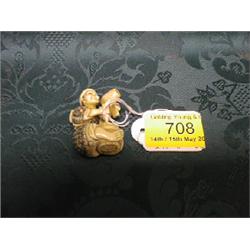 A Japanese ivory netsuke study of a cask-maker seated working upon his latest creation.