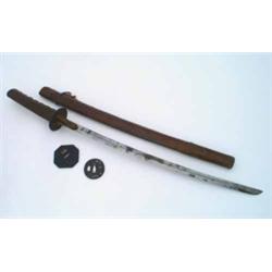 A Japanese tri-metal tsuba, depicting in relief an elderly gentleman in a landscape with trees (signs of repair), W 2.5ins, together with an octagonal carved fruitwood example, inset with ivory flowers and insects, with carved design, W 3ins £80-120