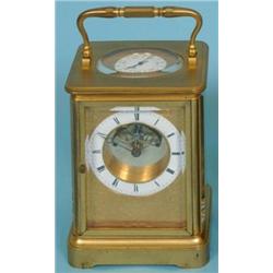 A Japy Freres Carriage Clock, with enamel annular chapter ring, rococo style engraved brass mask, the top inset a day and date dial, the movement striking the hours and half hours on a bell, in a brass case, 17 cm See colour illustration £2000-3000