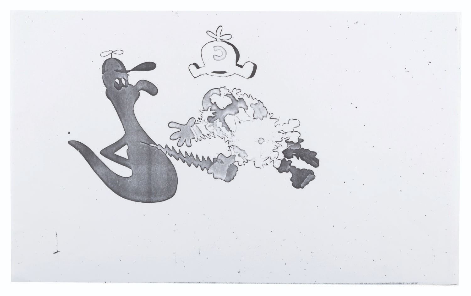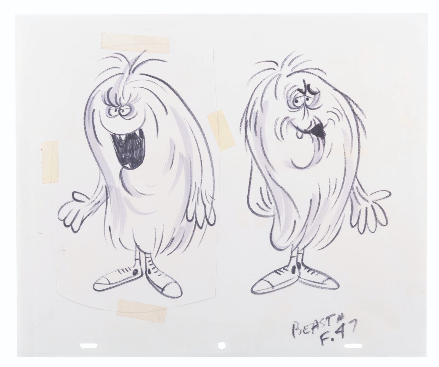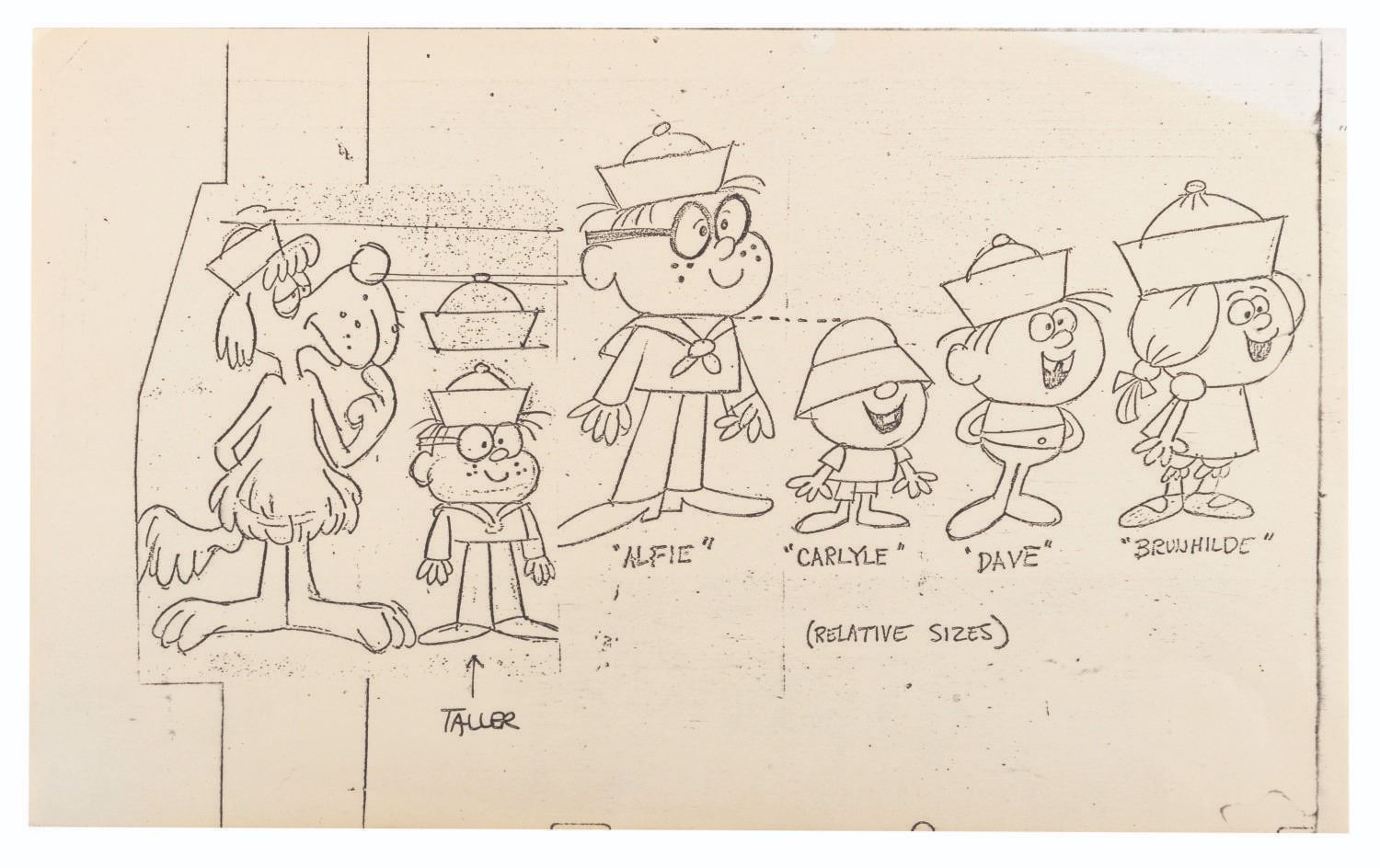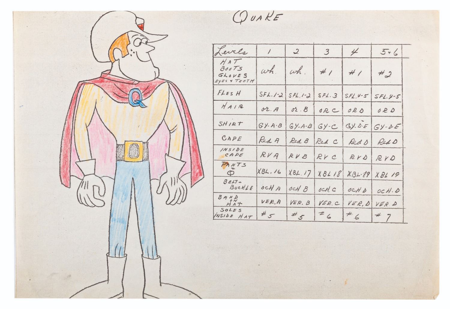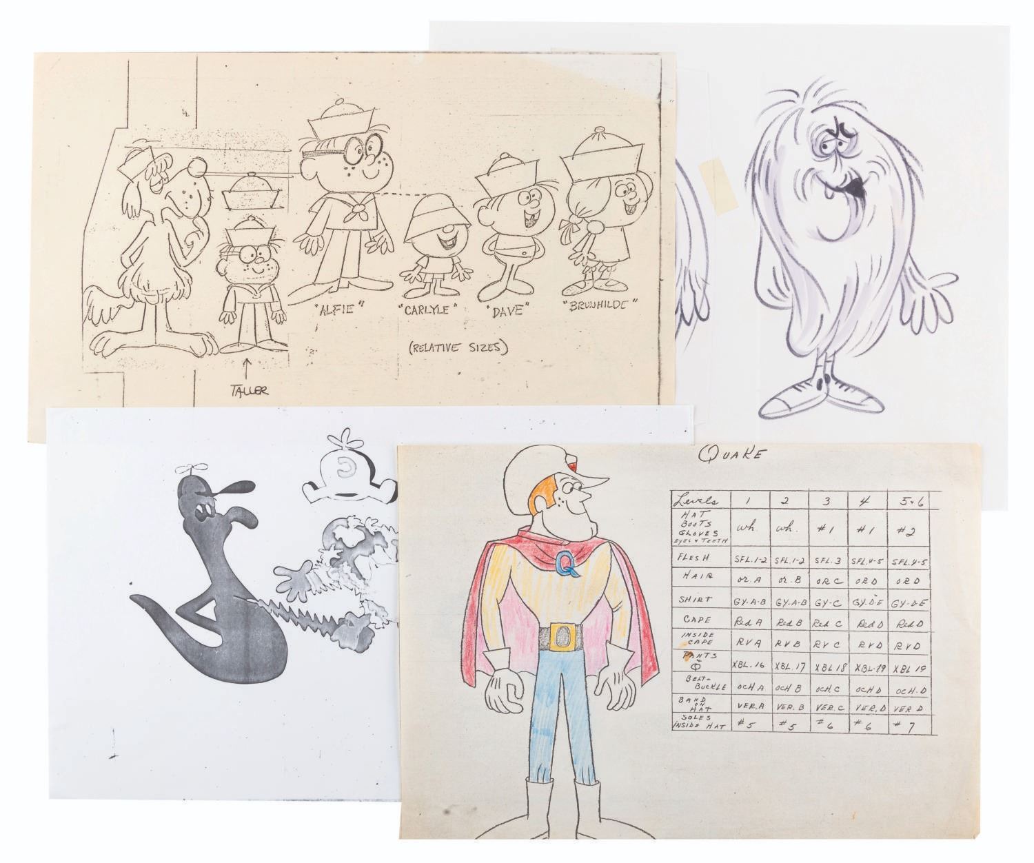 (Ward, 1960s-80s) A collection of production material for cereal commercials by Jay Ward Productions. Included is a photocopy height chart of the S.S. Guppy Crew Kids, a photocopy of the reverse of a cel from Cap’n Crunch, a hand colored paint guide for Quake accomplished in colored pencil, and a hand-drawn Beast character design from an unidentified production accomplished in marker. Measuring from 8.5” x 12.5” to 10.5” x 12.5” with character image sizes of 2.25” x 1.5” to 8.5” x 4.5”, the collection is in very good condition with light edge wear and creasing from production use, and light discoloration from age.