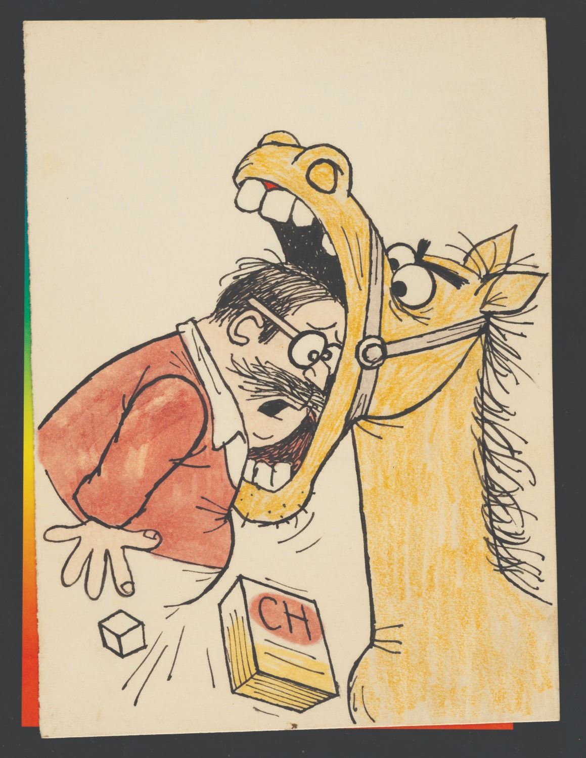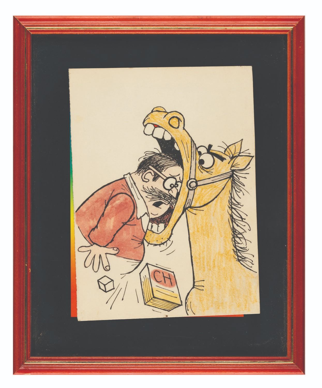 (Ward, 1960s) An original drawing of the “Hoppity Hooper” minor character, Charlie Horse eating Jay Ward’s head. With an image size of 5.5” x 6” on 5.5” x 7.5” drawing paper in a 8.75” x 10.75” frame, the color pencil and marker drawing displays in very good condition with light stains and edge wear, while the frame is in good condition with light scuffs and wear.